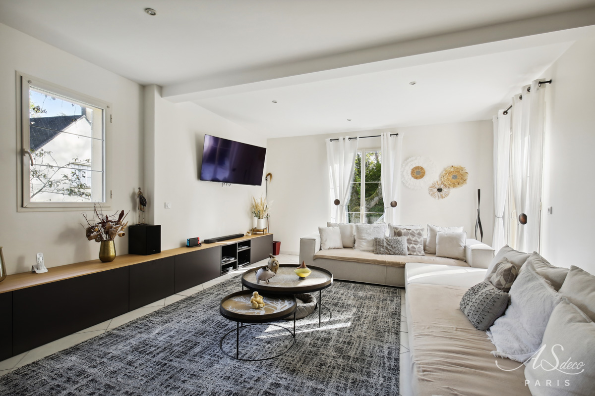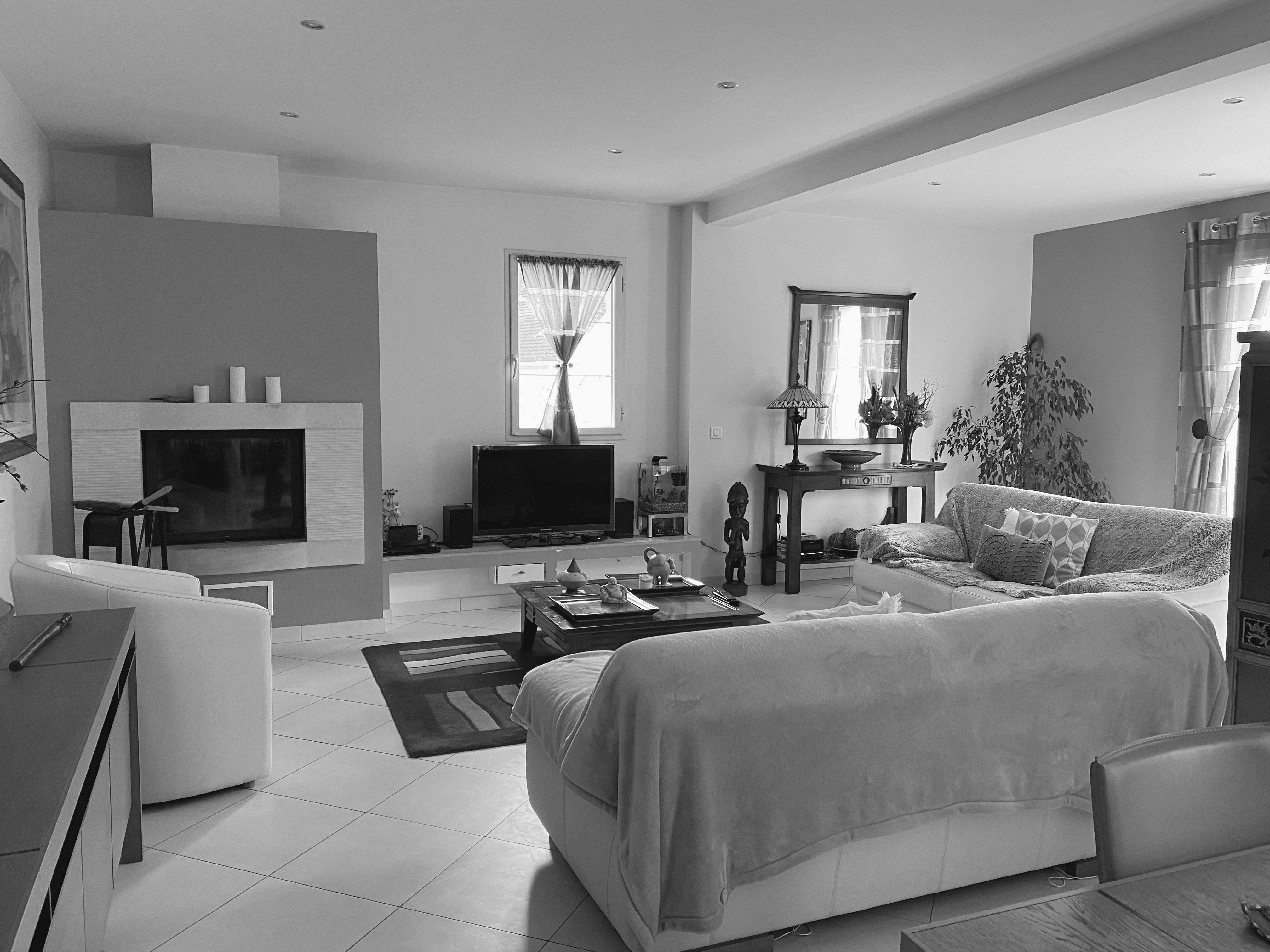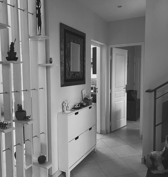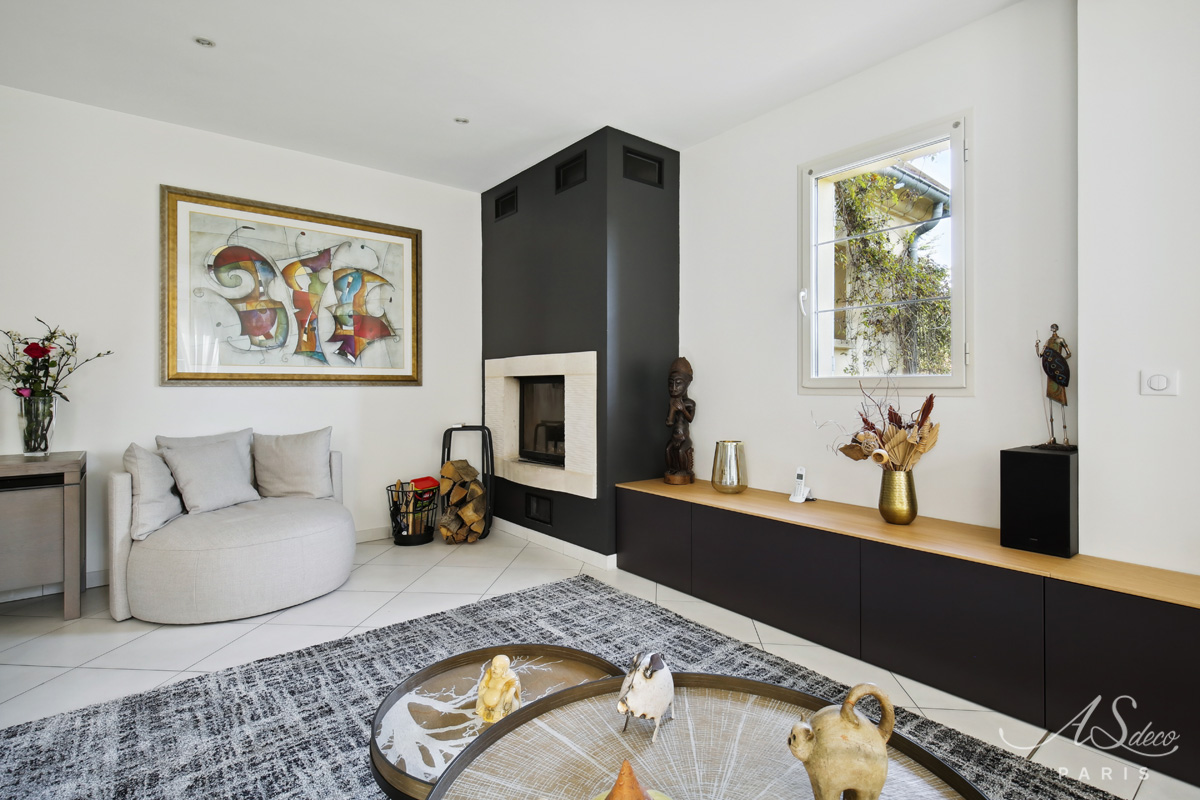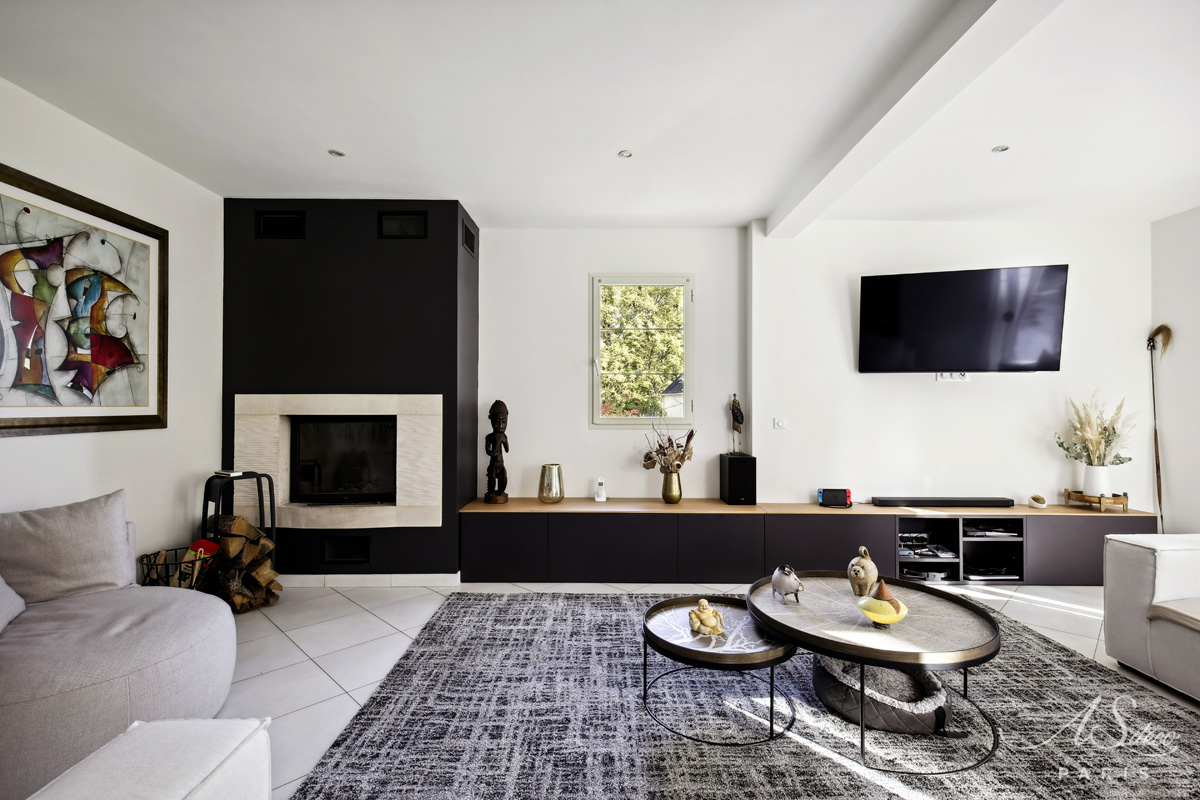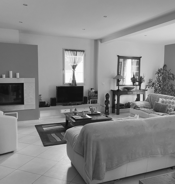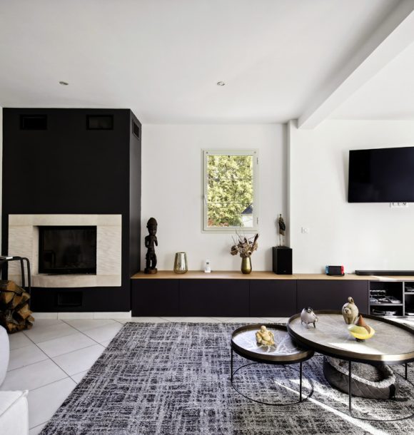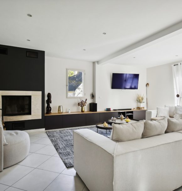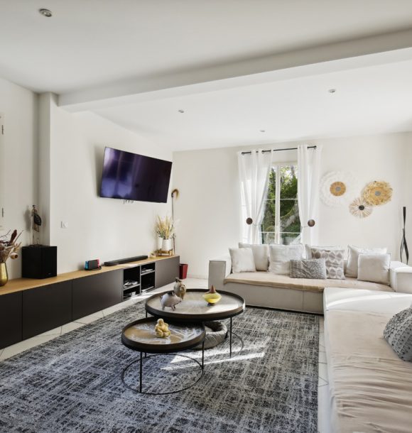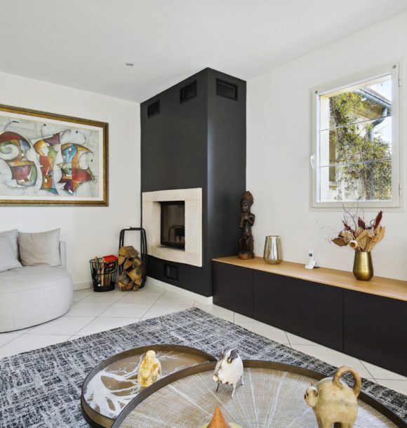 Le salon invite à la détente, avec son canapé d’angle clair, sa cheminée contemporaine et ses touches de décoration ethnique qui ajoutent du caractère à l’ensemble. Chaque pièce a été soigneusement conçue pour refléter une élégance intemporelle tout en intégrant les objets personnels d’Elodie, lui permettant ainsi de s’approprier pleinement son espace.