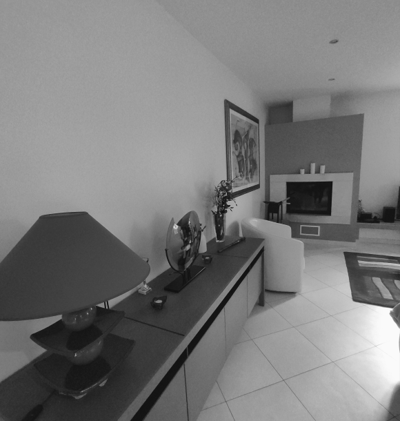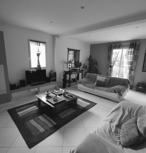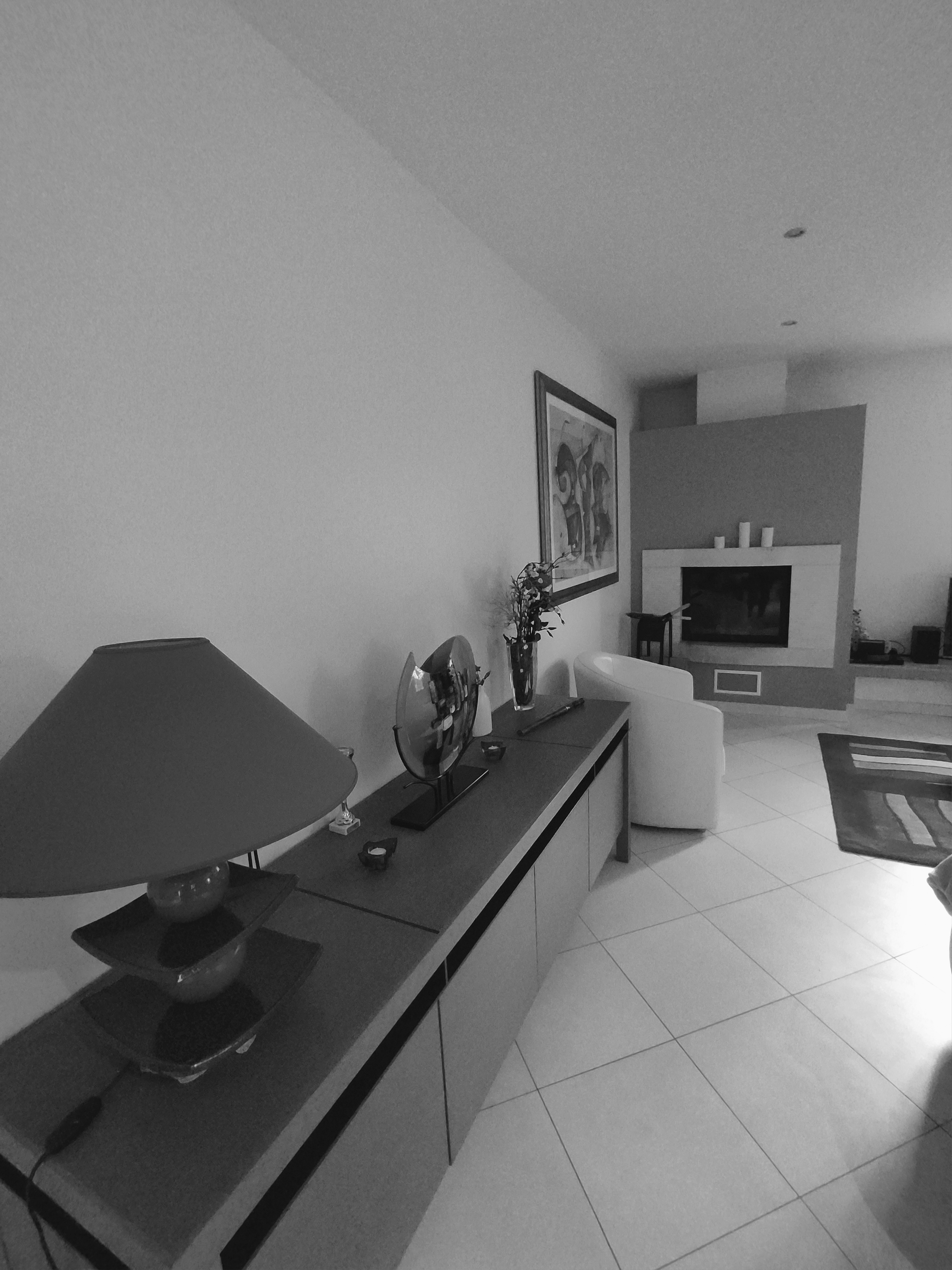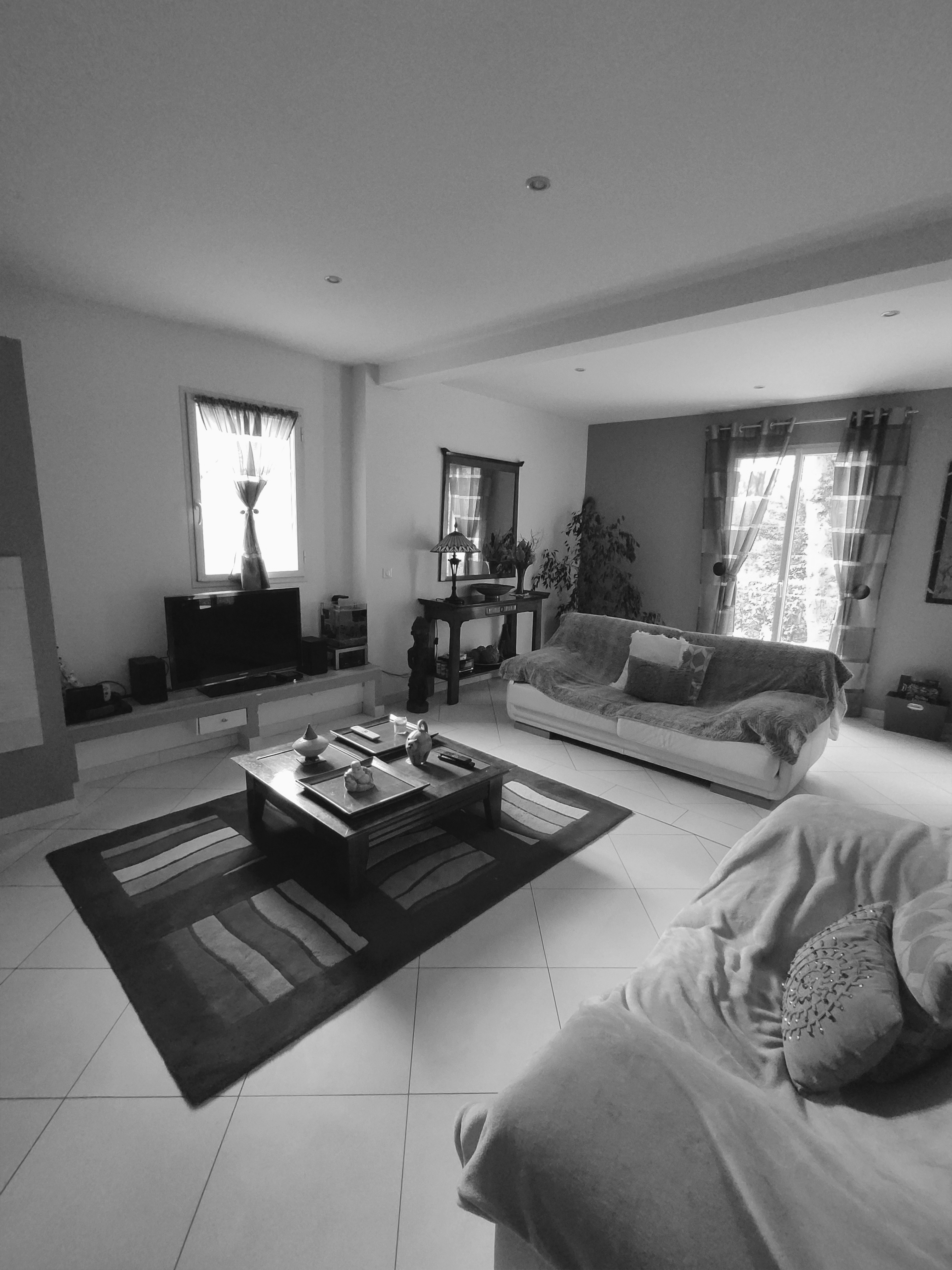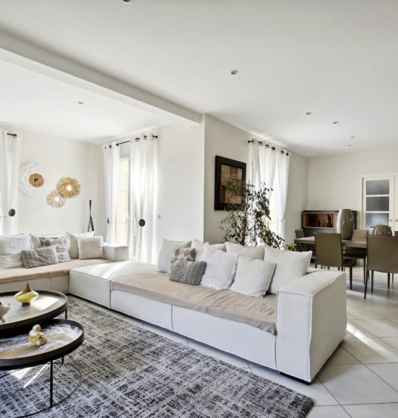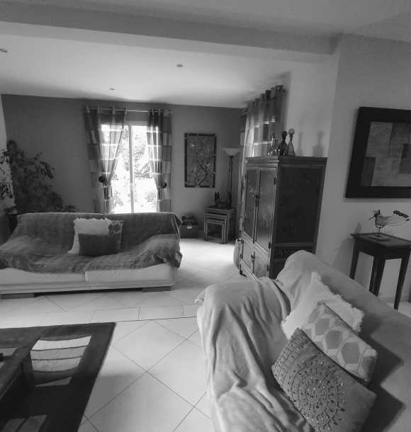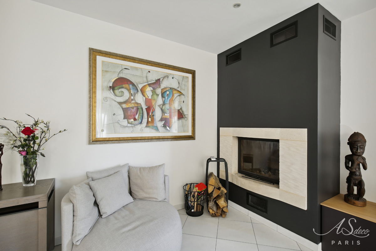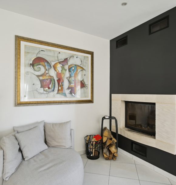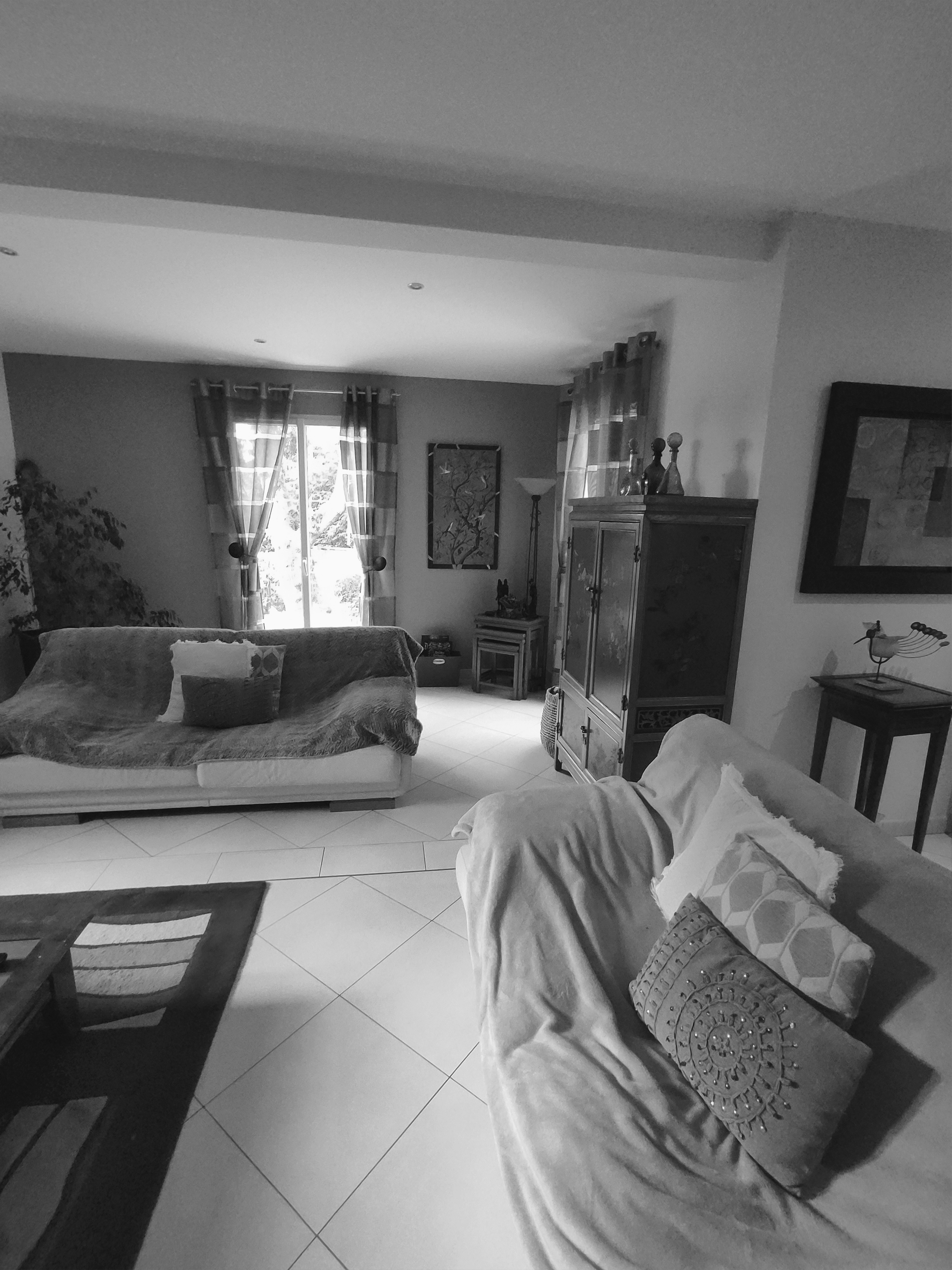 Le salon invite à la détente, avec son canapé d’angle clair, sa cheminée contemporaine et ses touches de décoration ethnique qui ajoutent du caractère à l’ensemble. Chaque pièce a été soigneusement conçue pour refléter une élégance intemporelle tout en intégrant les objets personnels d’Elodie, lui permettant ainsi de s’approprier pleinement son espace.