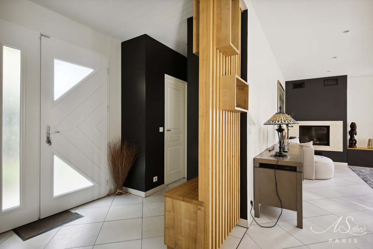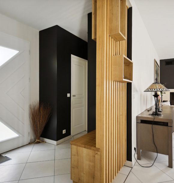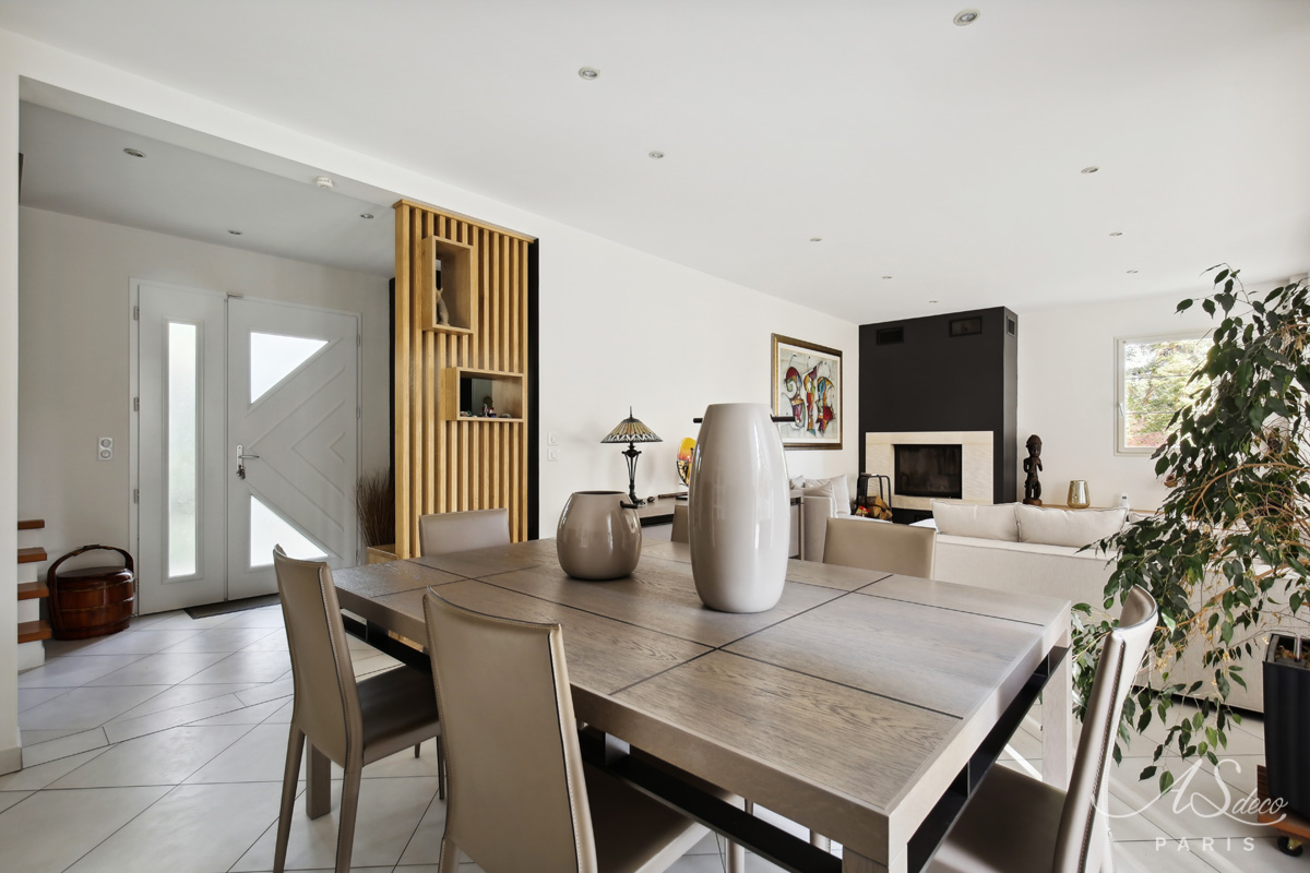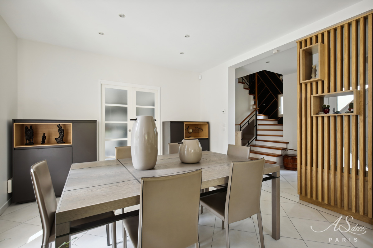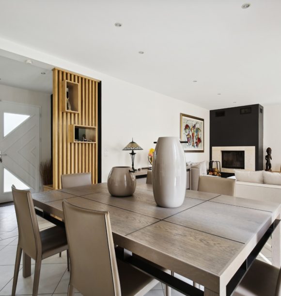 La salle à manger s’anime autour d’un claustra en chêne, créant une séparation visuelle subtile sans cloisonner l’espace entre le séjour et l’entrée.