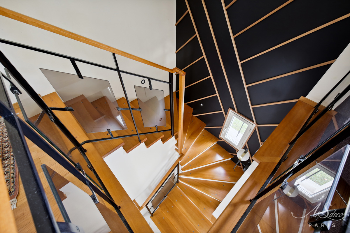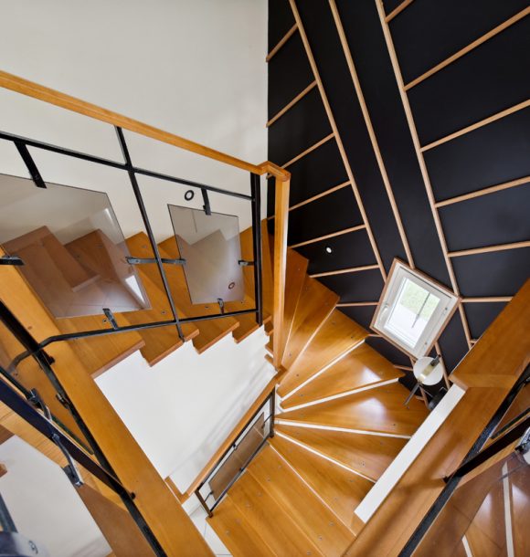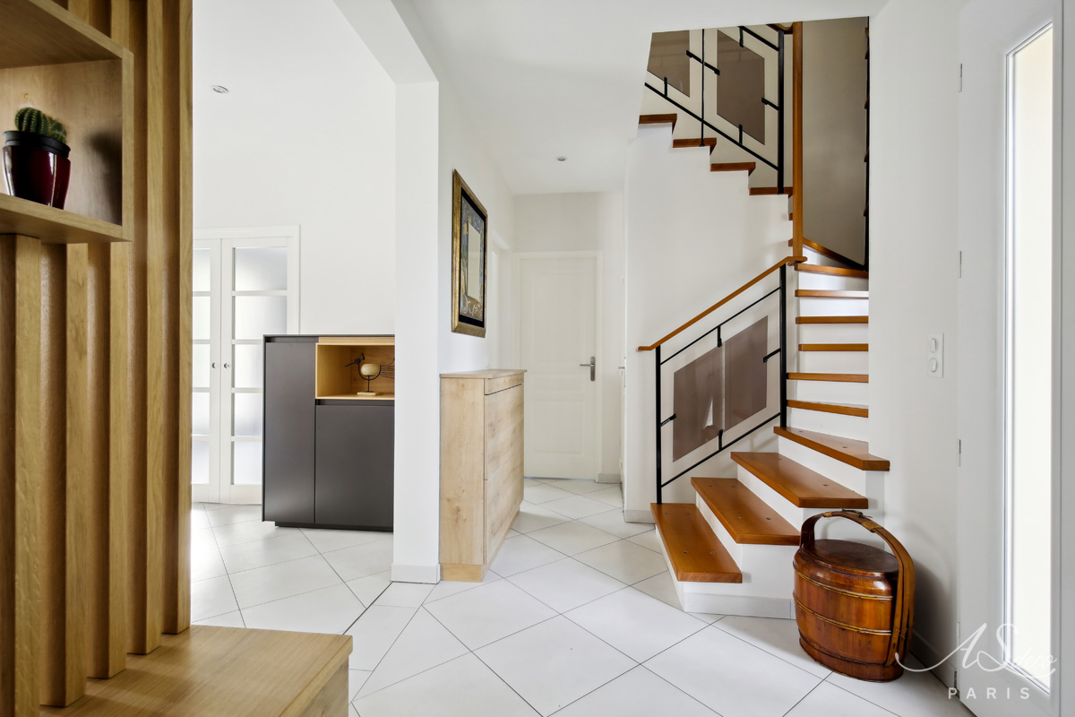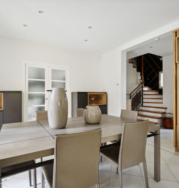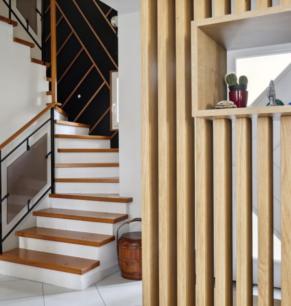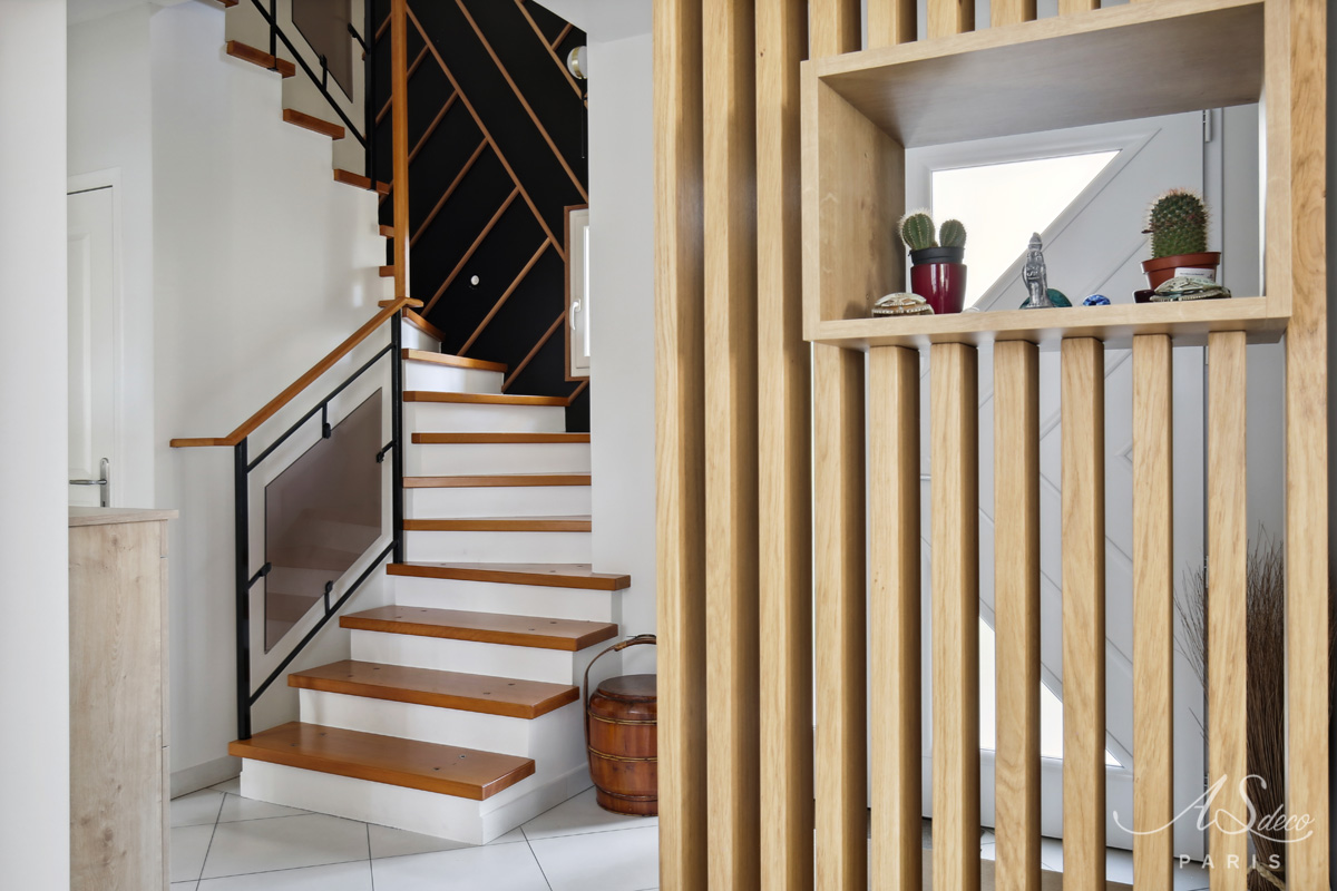 La salle à manger s’anime autour d’un claustra en chêne, créant une séparation visuelle subtile sans cloisonner l’espace entre le séjour et l’entrée.