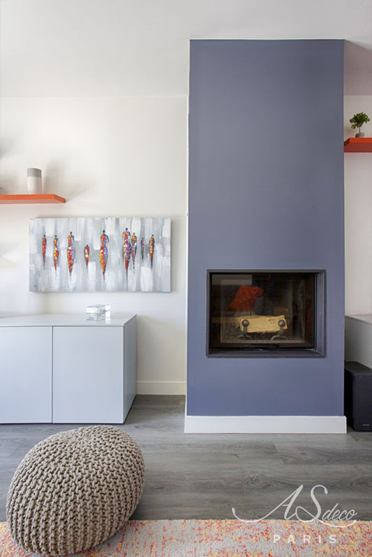 Etant donné la proximité avec la cuisine et cette dernière possédant un bar avec espace repas, nous avons supprimé l’espace salle à manger du séjour orientant toute la décoration autour de la cheminée, élément central de la pièce.