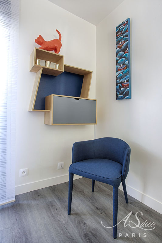 Enfin, pour délimiter l’entrée du séjour, nous avons dessiné un claustra bleu “dynamique” pour correspondre aux teintes utilisées sur les tableaux de Caroline.