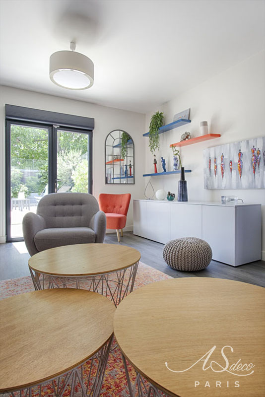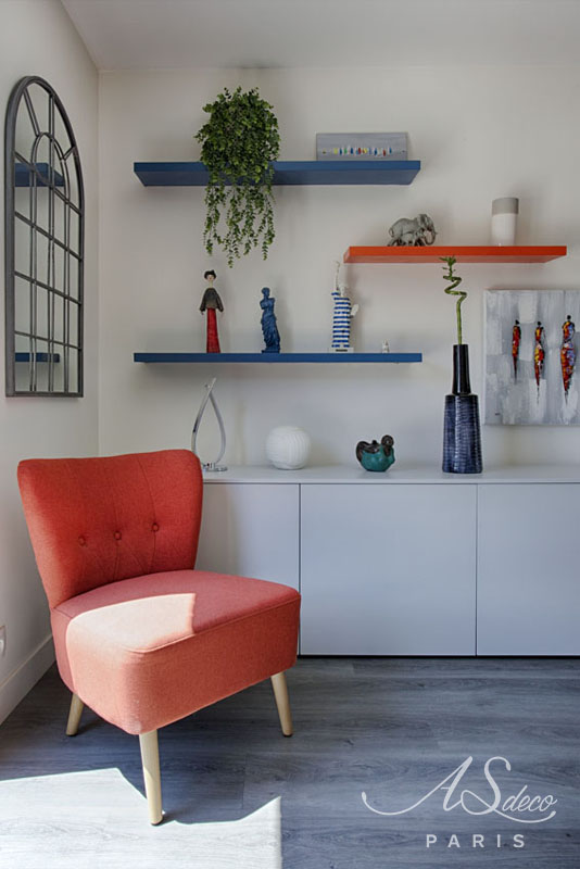 D’un salon “classique”, nous sommes arrivés à créer un espace fonctionnel et plein de gaieté grâce au choix des couleurs des murs, des meubles et des accessoires décoratifs.