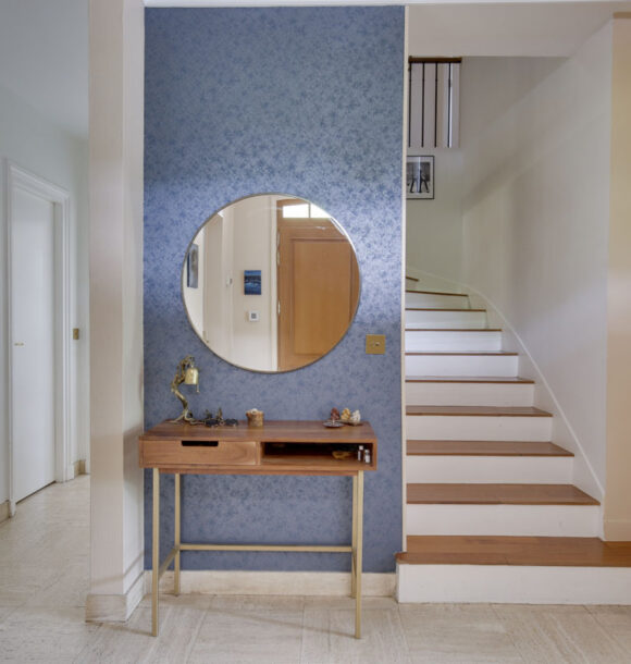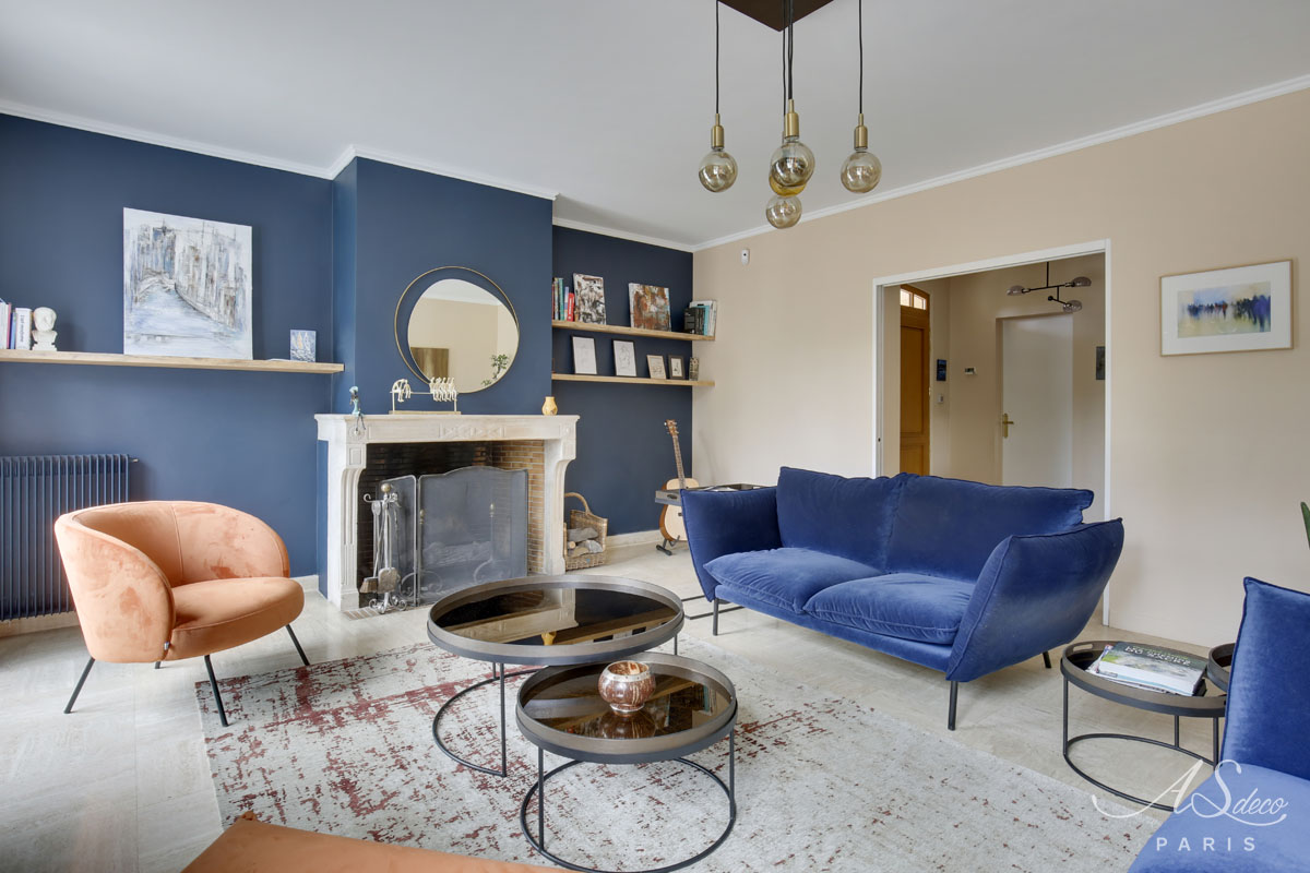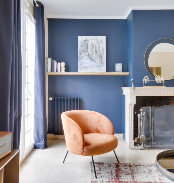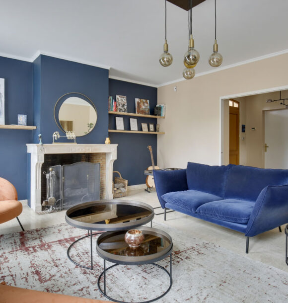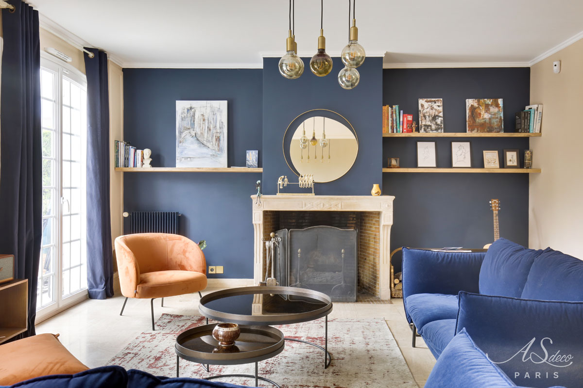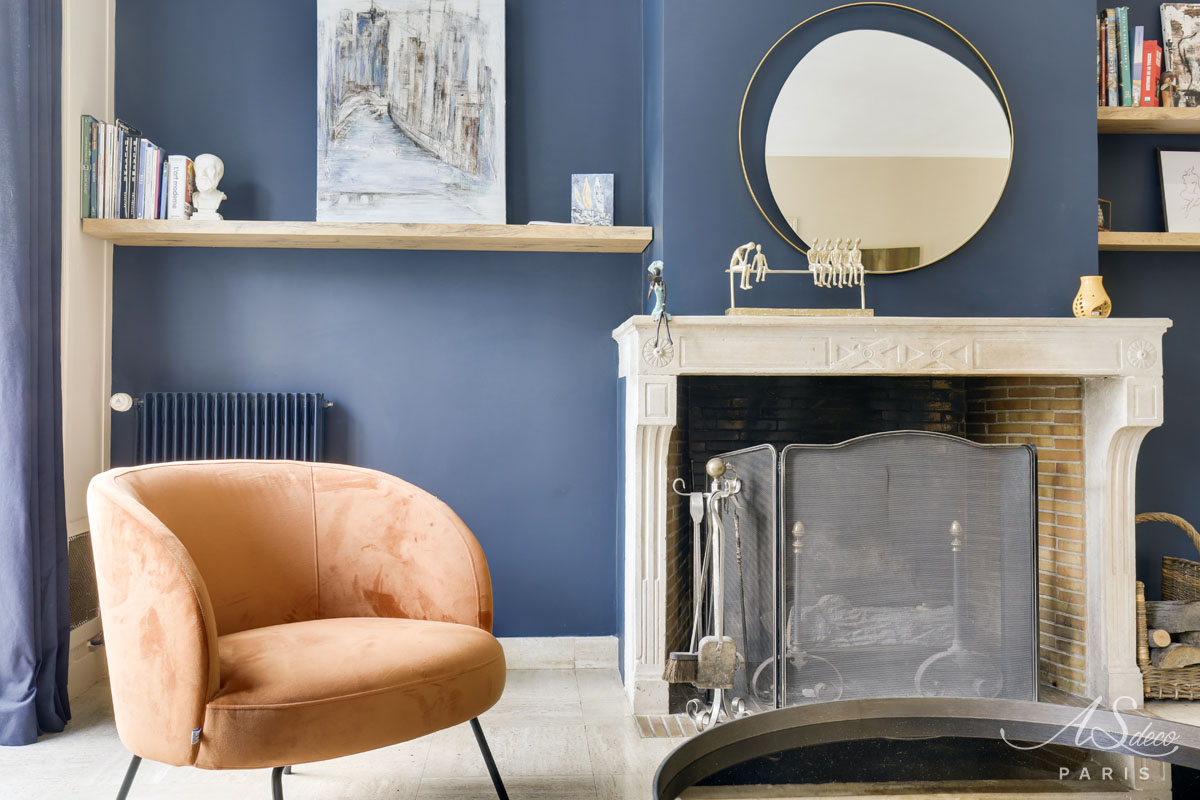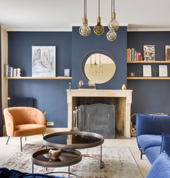 Notre choix de mobilier s’est porté sur des éléments au style raffiné et quelque peu art déco. Le papier-peint irisé de l’entrée associé à l’interrupteur vintage doré a donné le ton dès l’entrée dans la maison. Nous avons ensuite sélectionné une peinture bleue nuit pour mettre en valeur la cheminée, faisant ressortir le miroir et les étagères finition bois de part et d’autre.