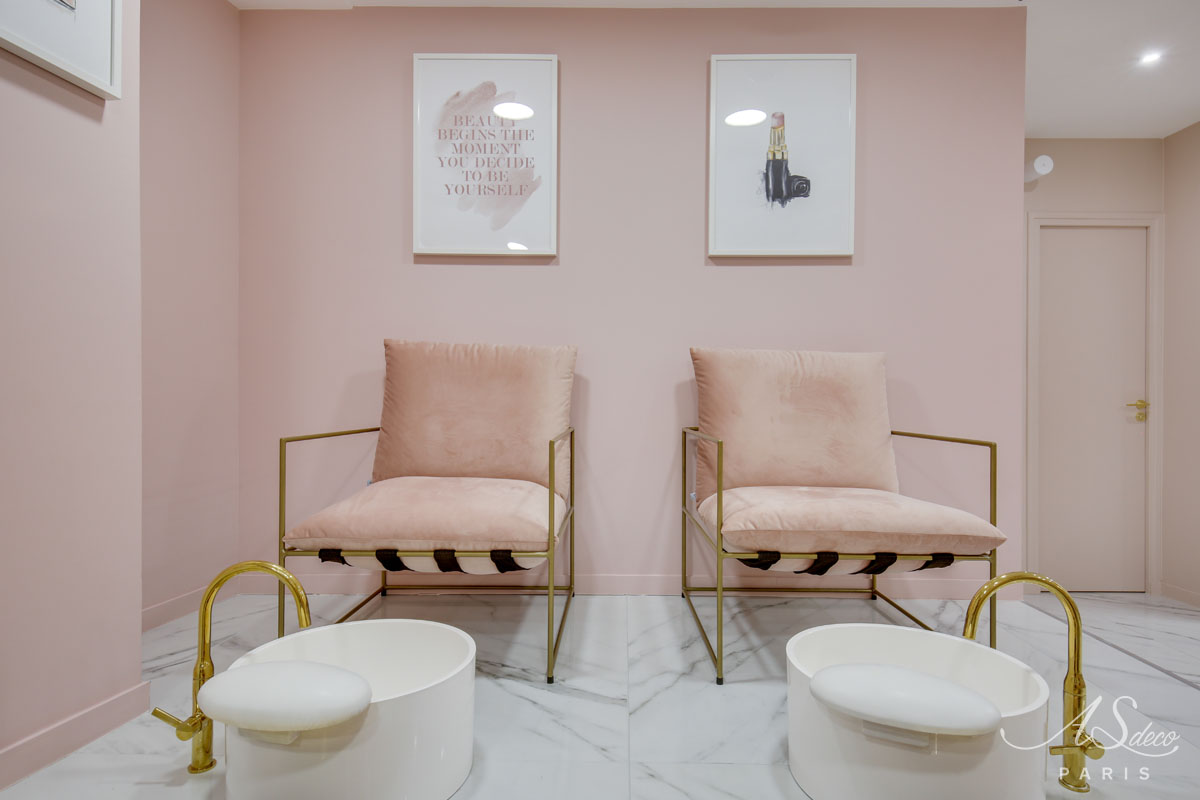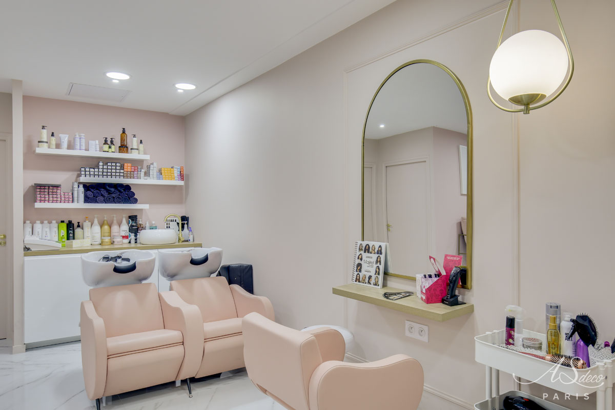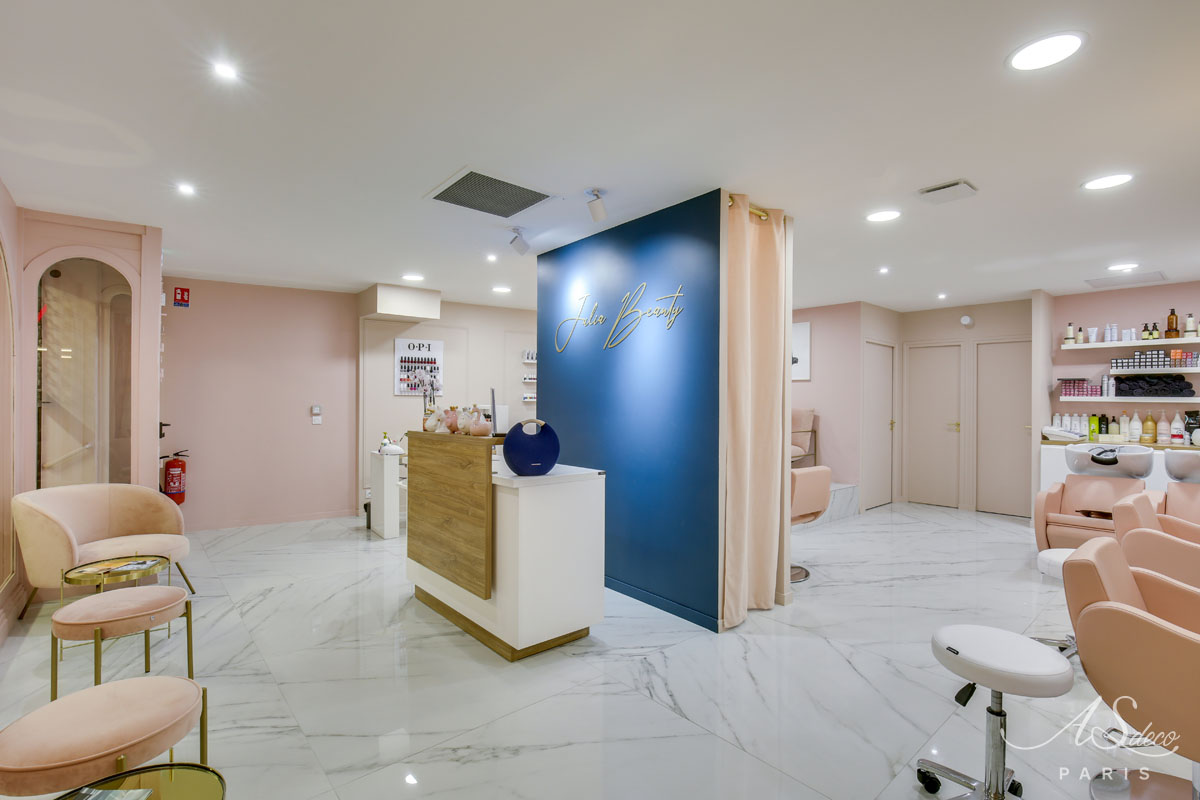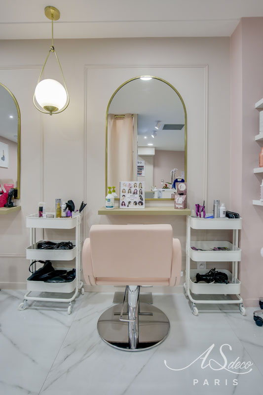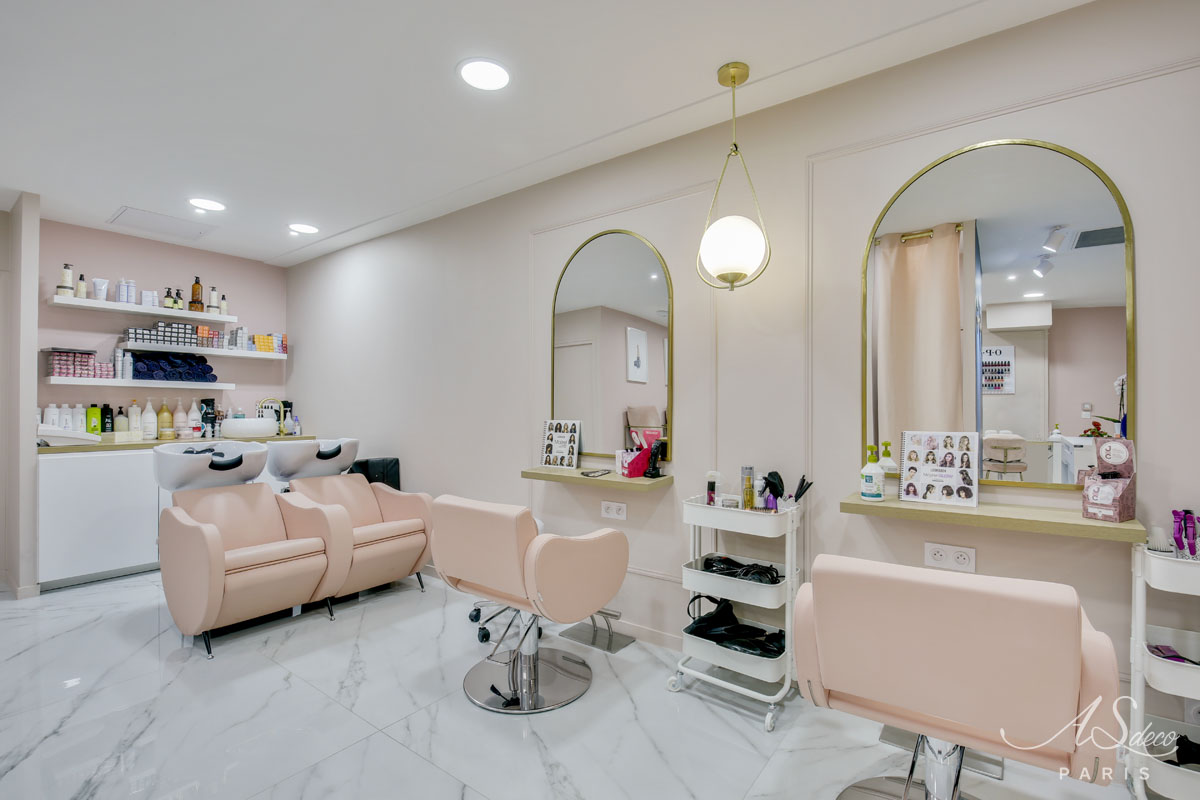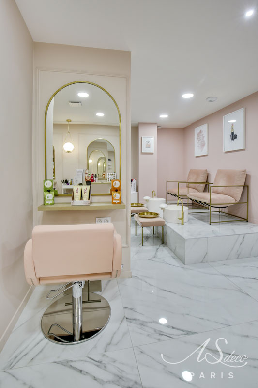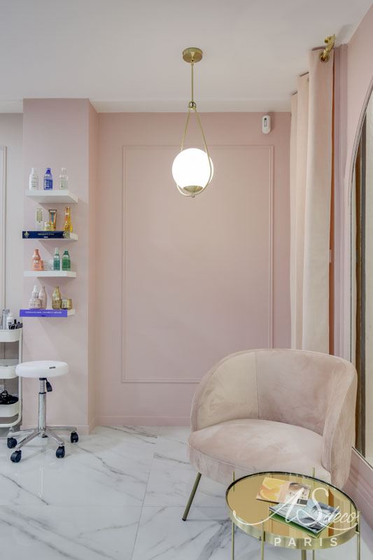 Nous avons opté pour des murs roses et beiges poudrés pour donner plus de clarté au local. Côté assises, nous avons choisi des revêtements couleur rose pastel s’associant parfaitement à la finition laiton du petit mobilier, miroirs et luminaires. Au niveau de la banque d’accueil, nous avons proposé un bleu profond au mur qui permettait de mettre en valeur le logo doré du salon. Nous avons même accompagné nos clients sur le choix de la typographie du logo et sa finition. Côté sol, nous avons sélectionné un carrelage effet marbre blanc afin d’apporter plus de luminosité dans ce local qui ne bénéficiait d’aucune lumière naturelle.
