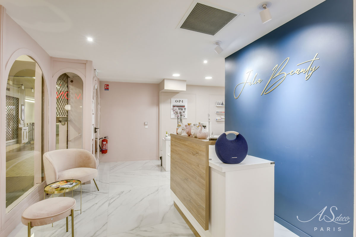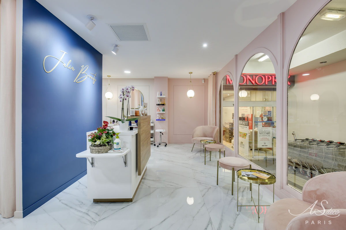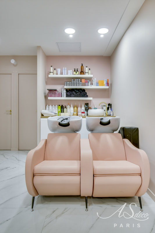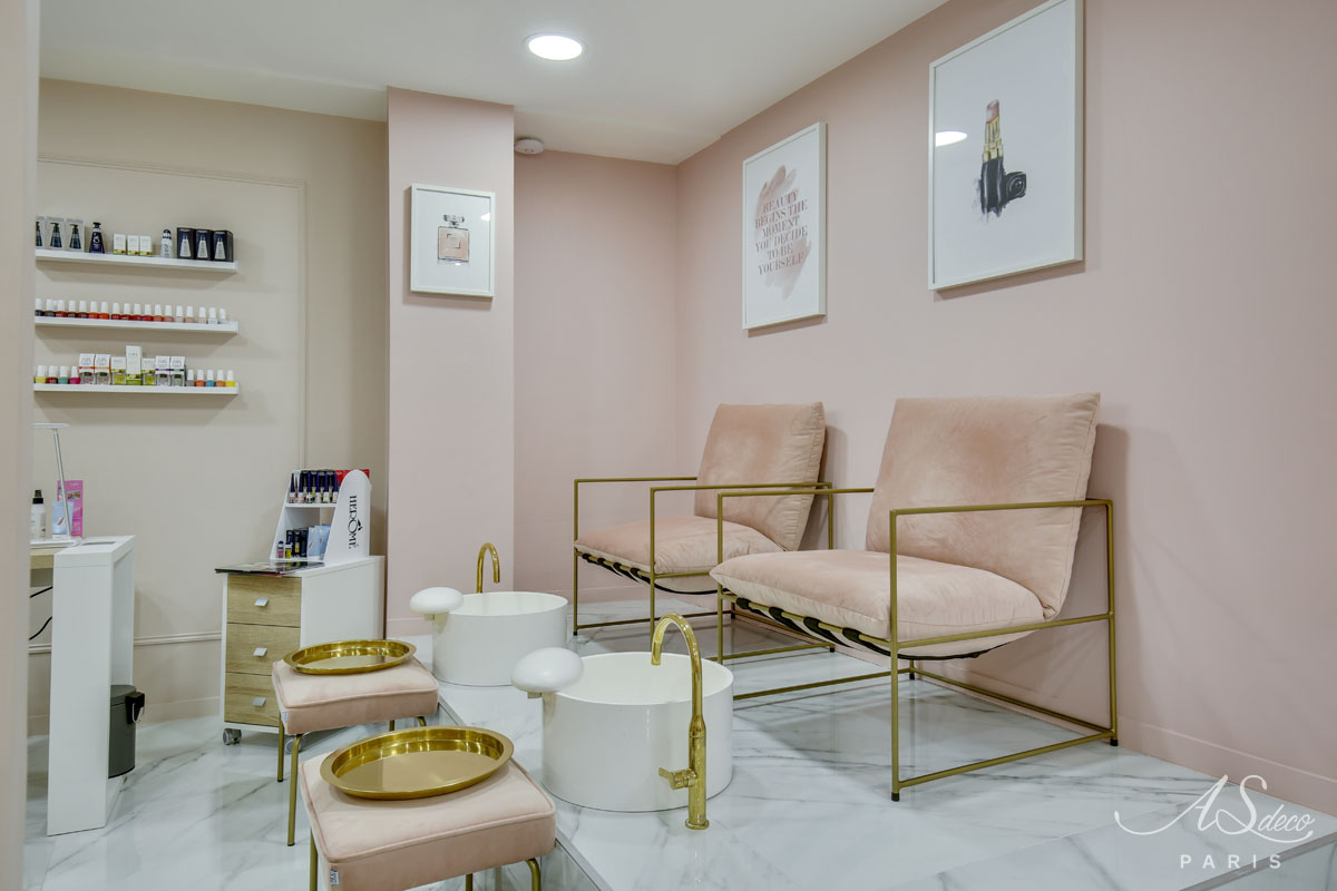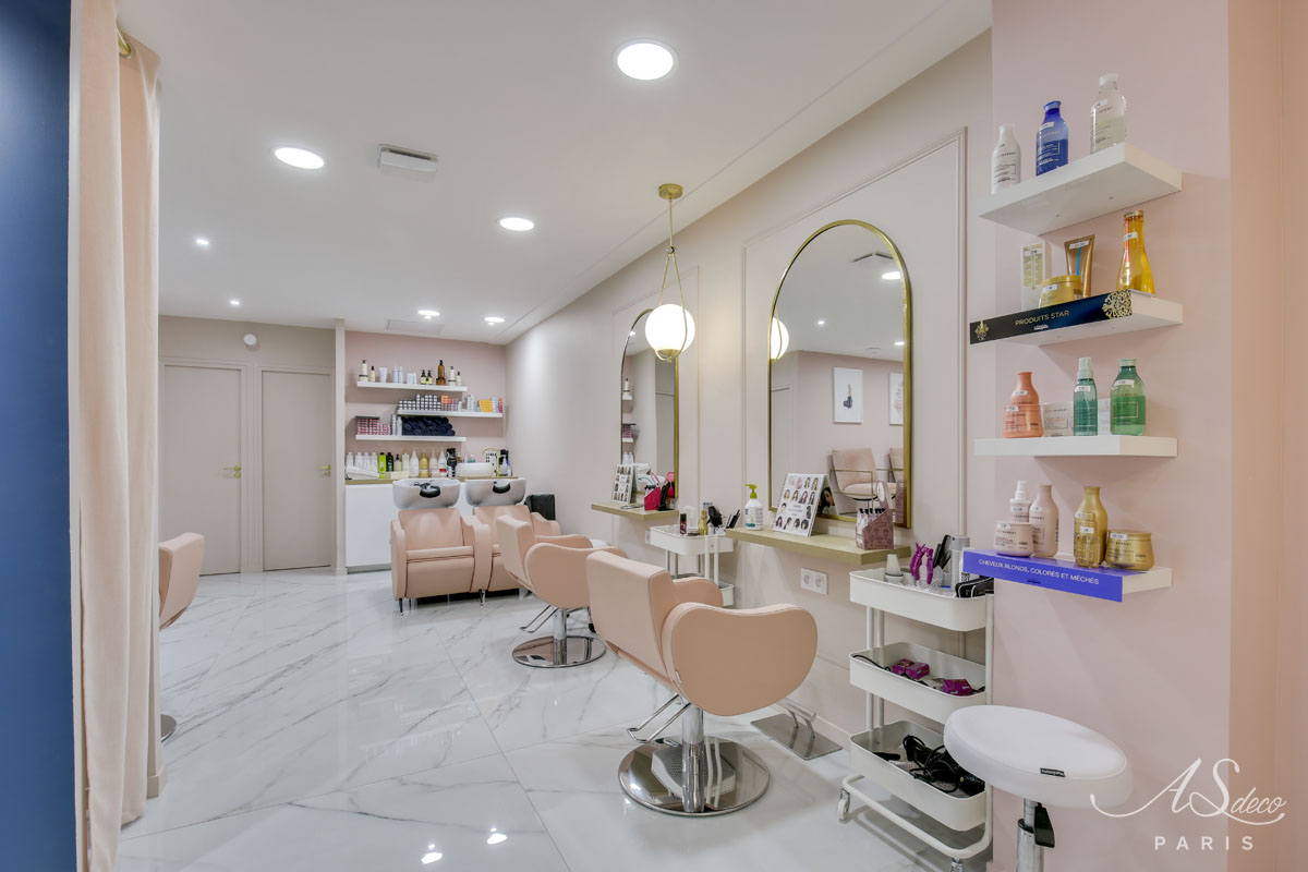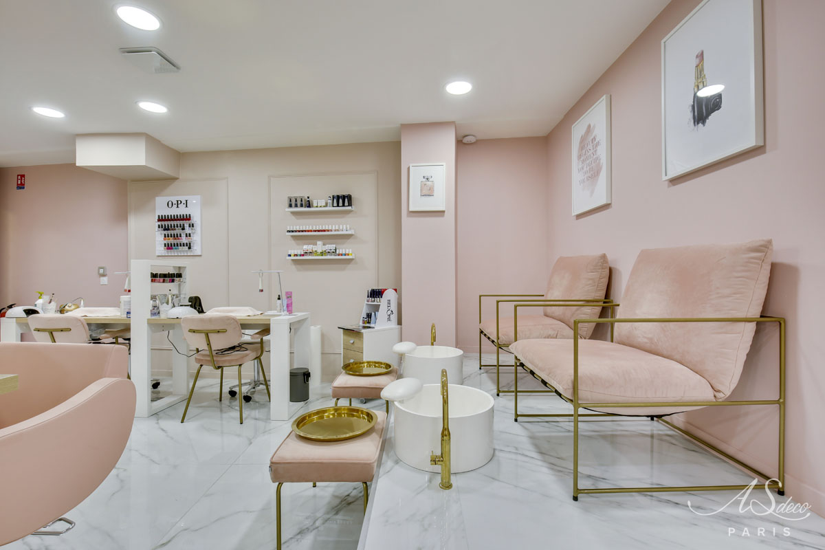 Nous avons opté pour des murs roses et beiges poudrés pour donner plus de clarté au local. Côté assises, nous avons choisi des revêtements couleur rose pastel s’associant parfaitement à la finition laiton du petit mobilier, miroirs et luminaires. Au niveau de la banque d’accueil, nous avons proposé un bleu profond au mur qui permettait de mettre en valeur le logo doré du salon. Nous avons même accompagné nos clients sur le choix de la typographie du logo et sa finition. Côté sol, nous avons sélectionné un carrelage effet marbre blanc afin d’apporter plus de luminosité dans ce local qui ne bénéficiait d’aucune lumière naturelle.