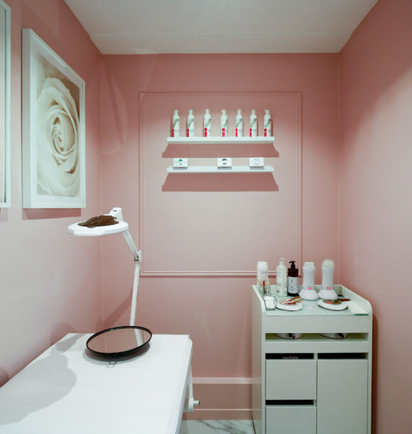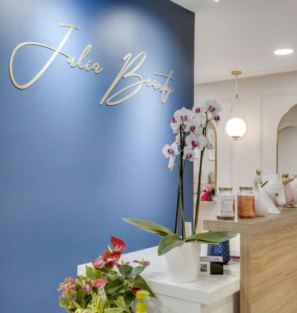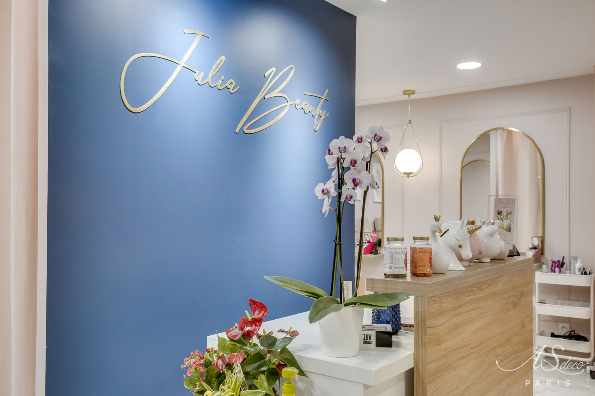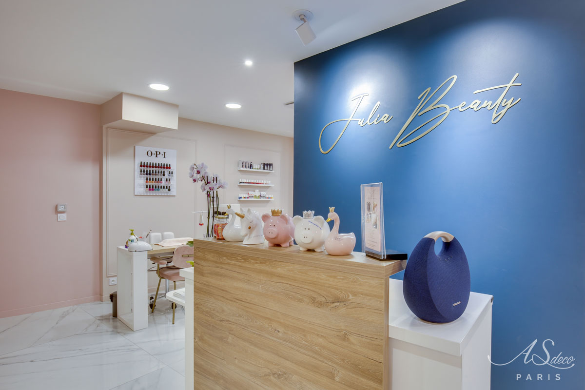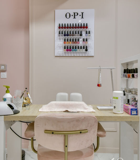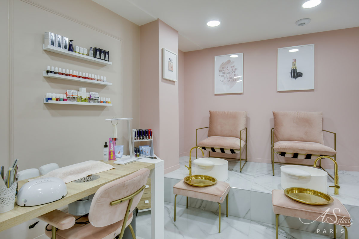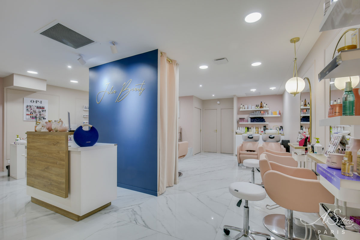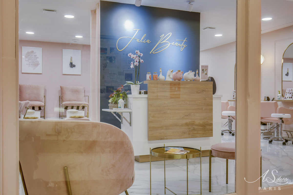 Nous avons opté pour des murs roses et beiges poudrés pour donner plus de clarté au local. Côté assises, nous avons choisi des revêtements couleur rose pastel s’associant parfaitement à la finition laiton du petit mobilier, miroirs et luminaires. Au niveau de la banque d’accueil, nous avons proposé un bleu profond au mur qui permettait de mettre en valeur le logo doré du salon. Nous avons même accompagné nos clients sur le choix de la typographie du logo et sa finition. Côté sol, nous avons sélectionné un carrelage effet marbre blanc afin d’apporter plus de luminosité dans ce local qui ne bénéficiait d’aucune lumière naturelle.