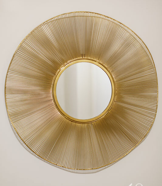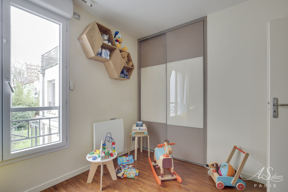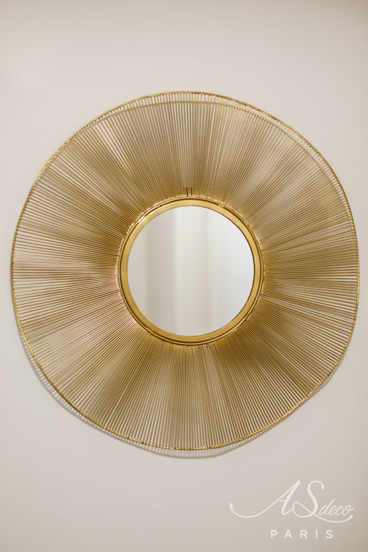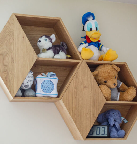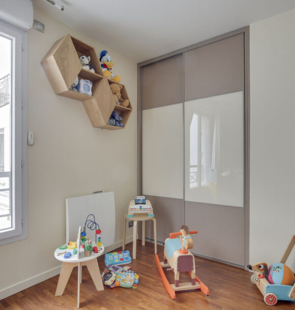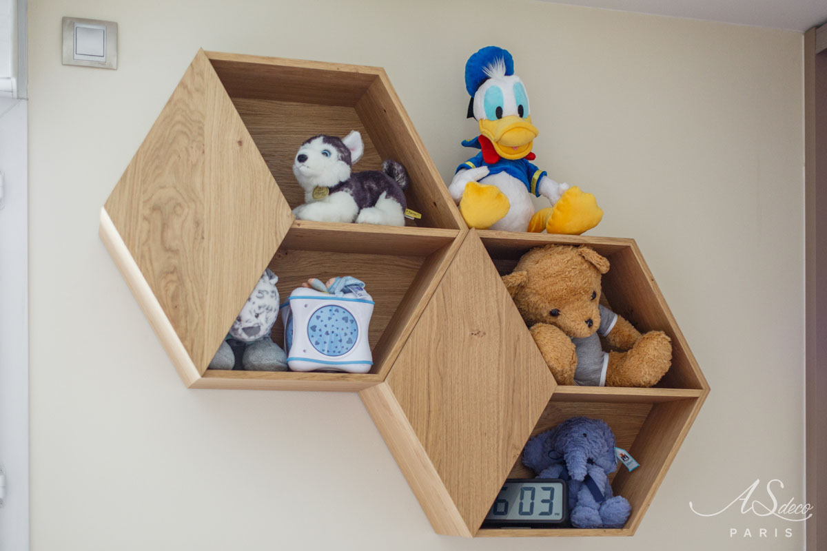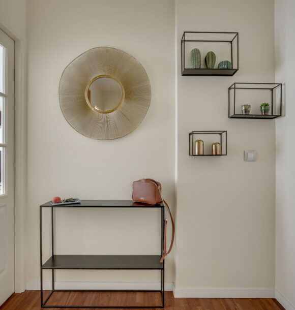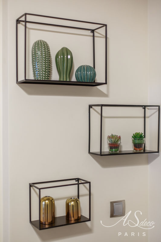 Notre choix de mobilier s’est porté sur des éléments au style raffiné et quelque peu art déco. Le papier-peint irisé de l’entrée associé à l’interrupteur vintage doré a donné le ton dès l’entrée dans la maison. Nous avons ensuite sélectionné une peinture bleue nuit pour mettre en valeur la cheminée, faisant ressortir le miroir et les étagères finition bois de part et d’autre.