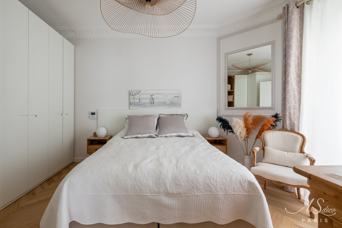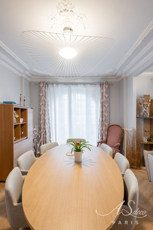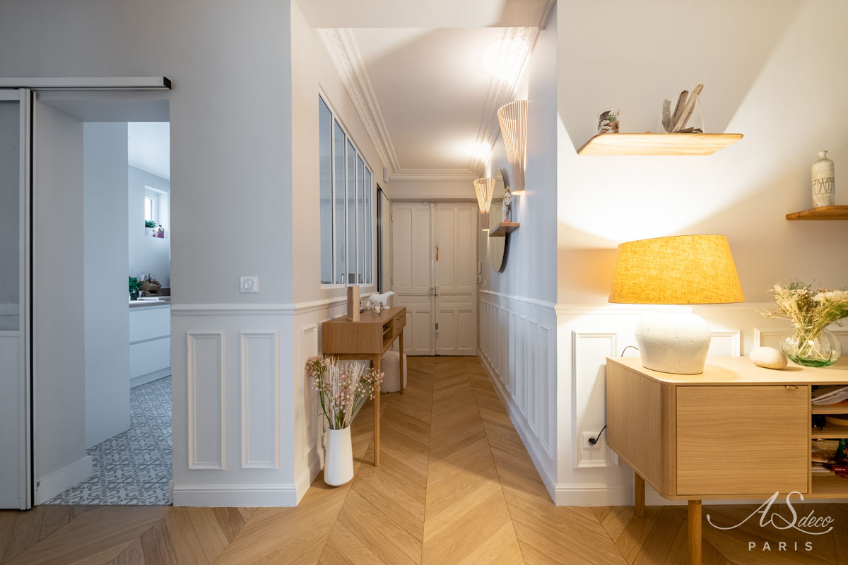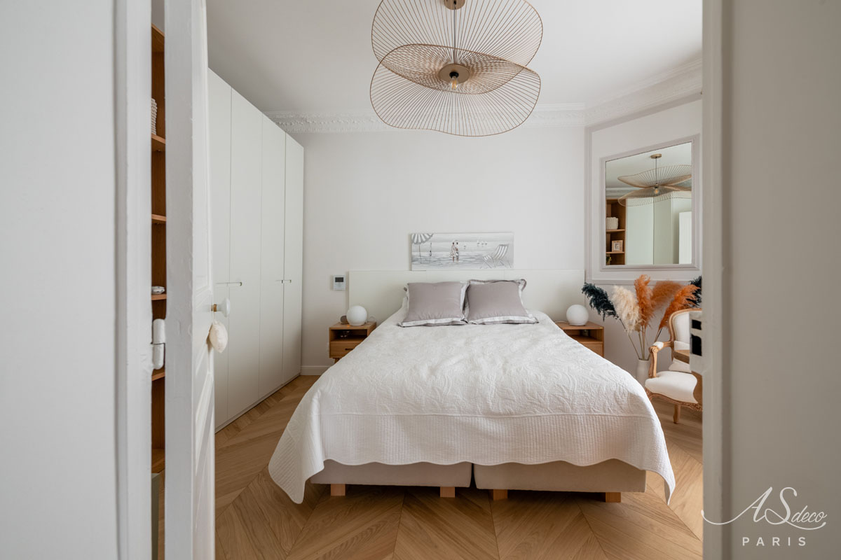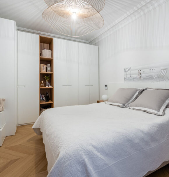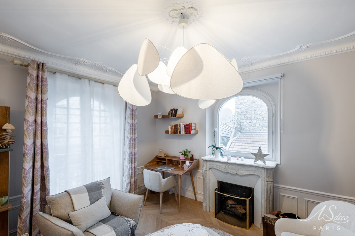 Nous avons donc réalisé notre étude en nous basant sur les goûts de nos clients pour le style scandinave et les jolies matières. D’une tonalité neutre, nous avons apporté de l’élégance avec des rideaux confectionnés sur-mesure par notre couturière et redonner tout son charme à l’appartement en proposant un parquet en point de Hongrie.