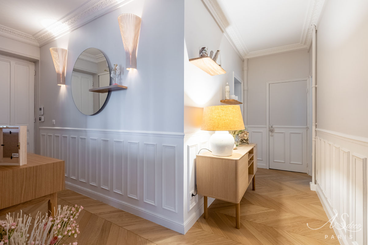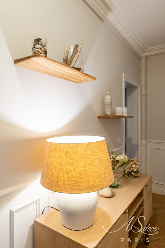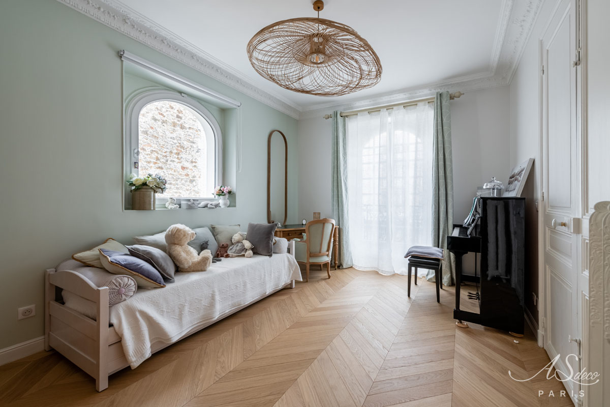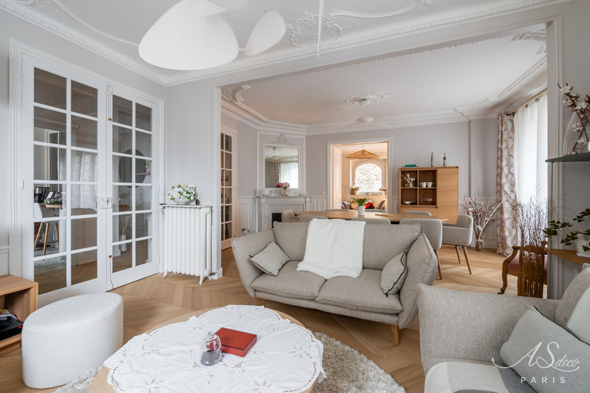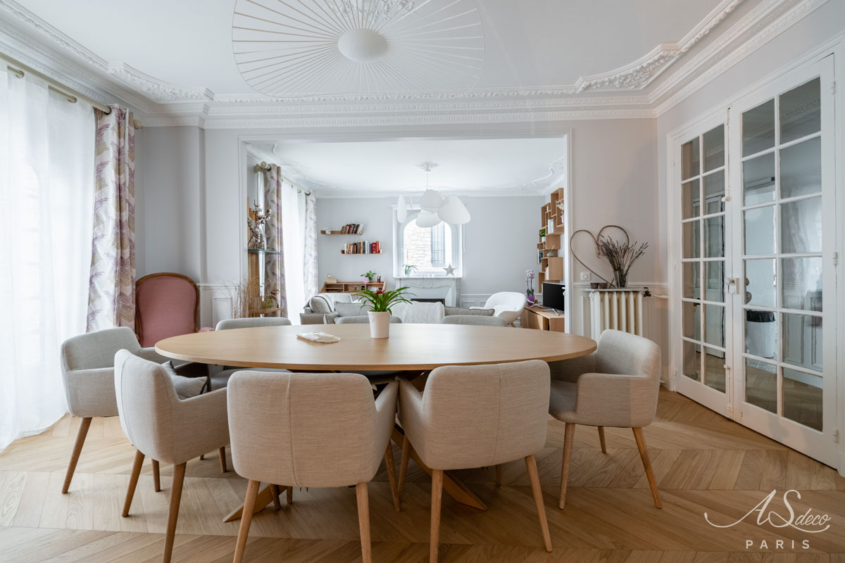 Nous avons donc réalisé notre étude en nous basant sur les goûts de nos clients pour le style scandinave et les jolies matières. D’une tonalité neutre, nous avons apporté de l’élégance avec des rideaux confectionnés sur-mesure par notre couturière et redonner tout son charme à l’appartement en proposant un parquet en point de Hongrie.