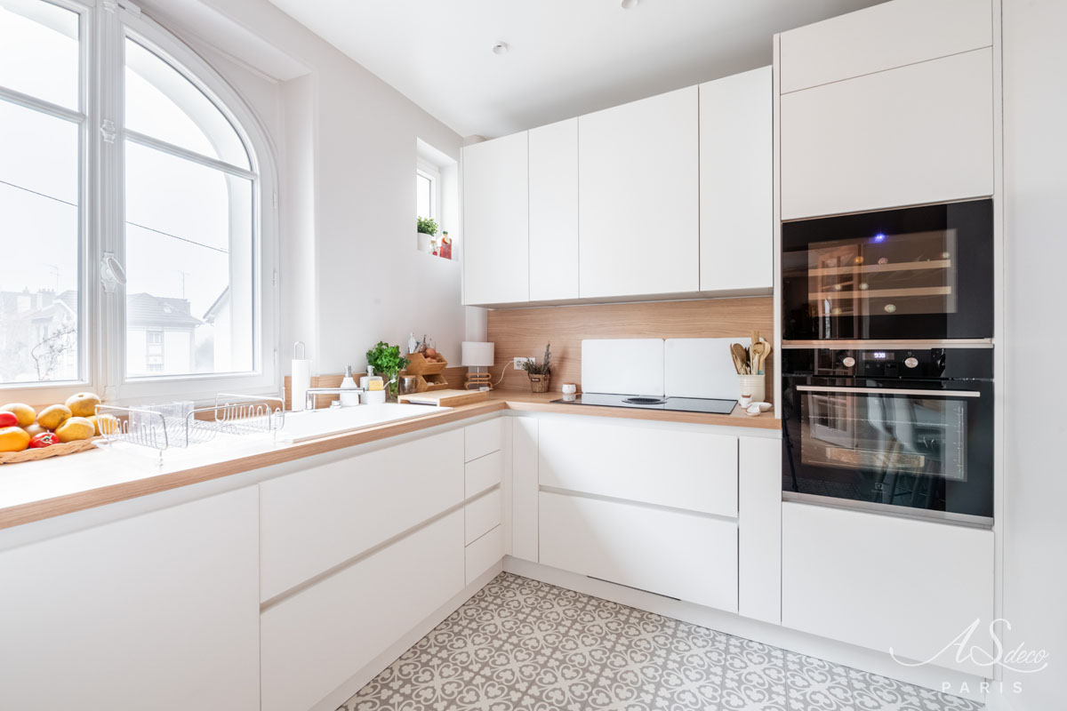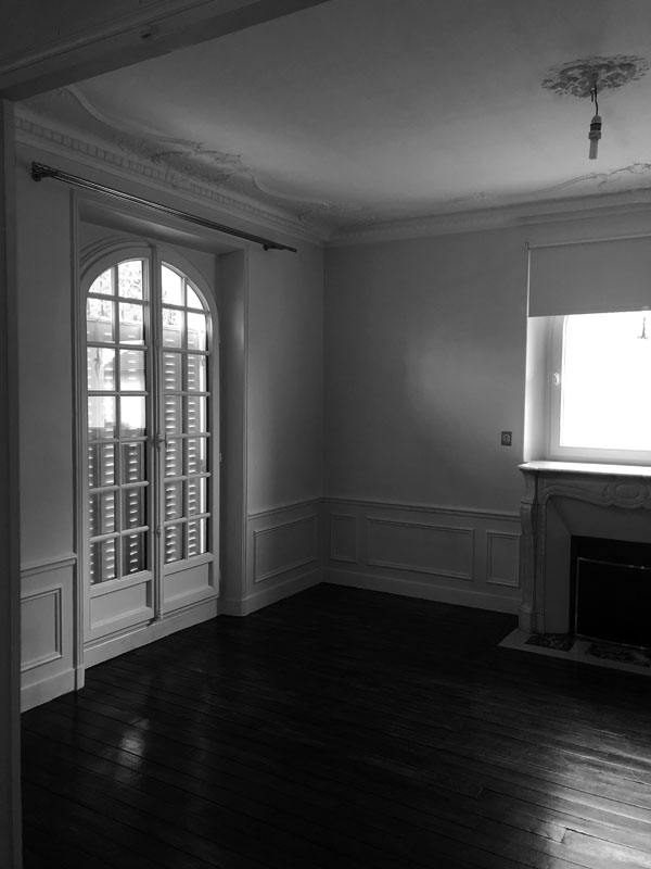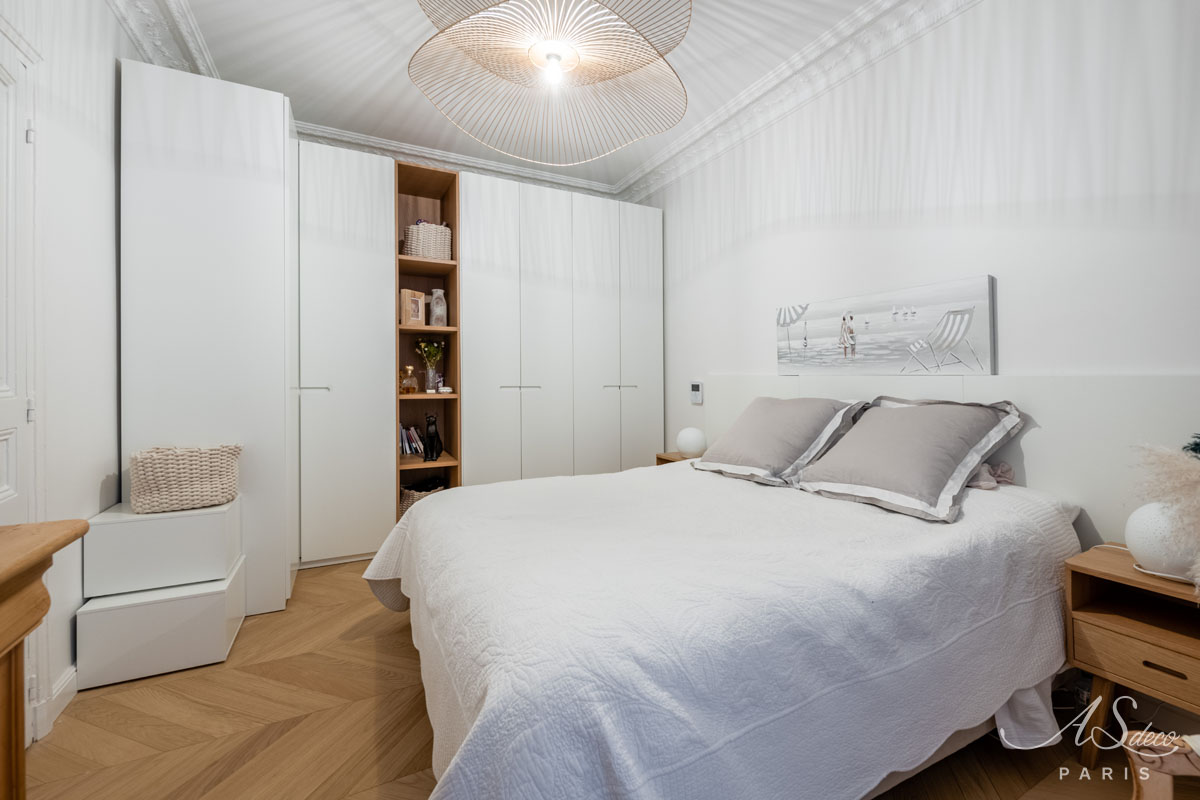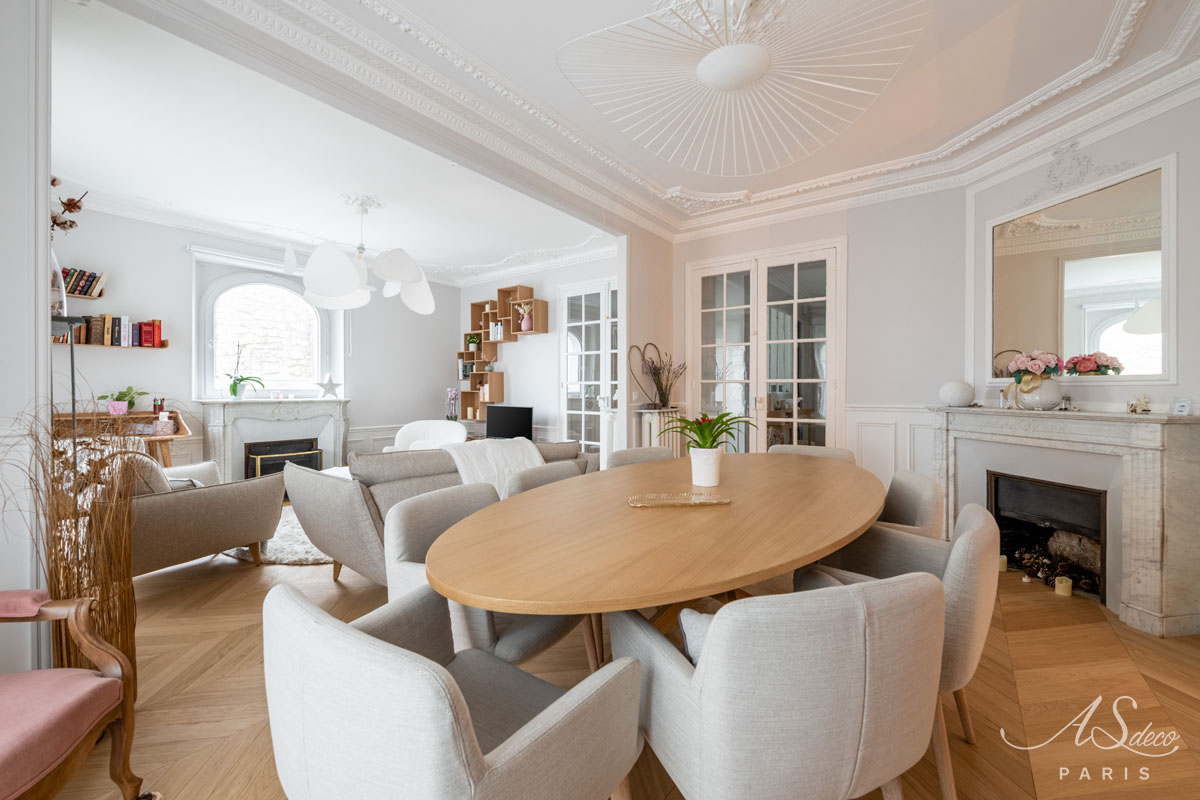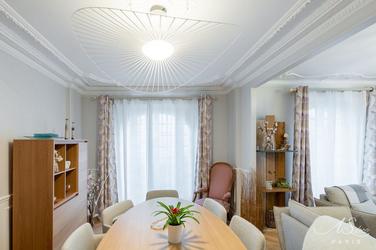 Nous avons donc réalisé notre étude en nous basant sur les goûts de nos clients pour le style scandinave et les jolies matières. D’une tonalité neutre, nous avons apporté de l’élégance avec des rideaux confectionnés sur-mesure par notre couturière et redonner tout son charme à l’appartement en proposant un parquet en point de Hongrie.