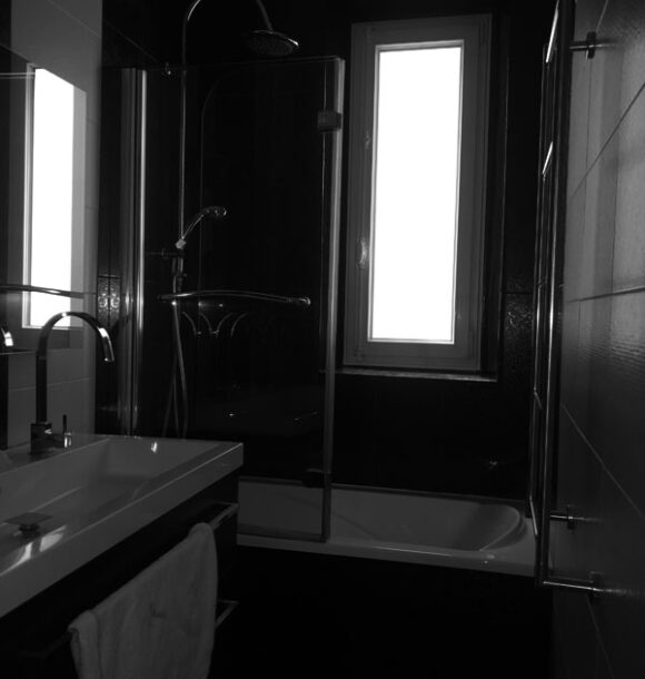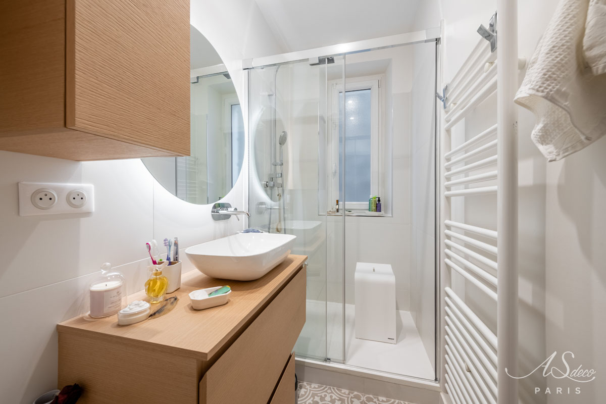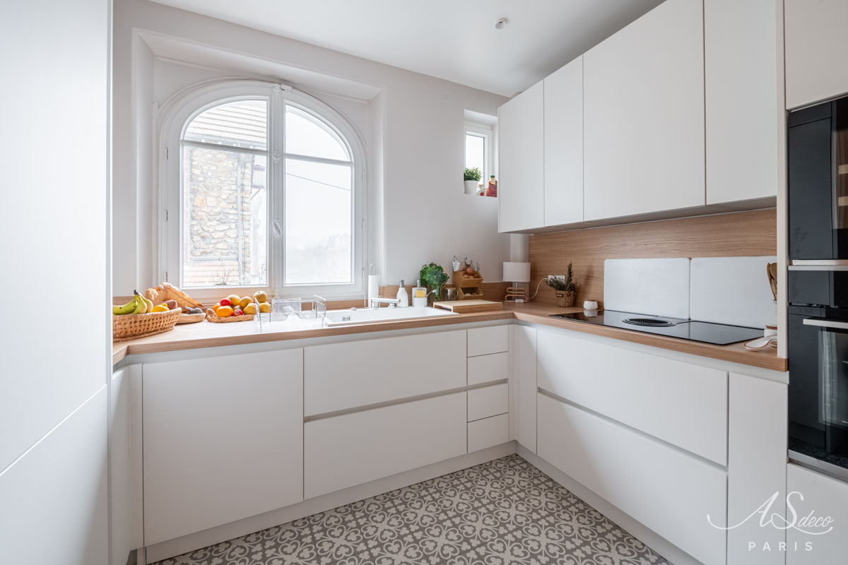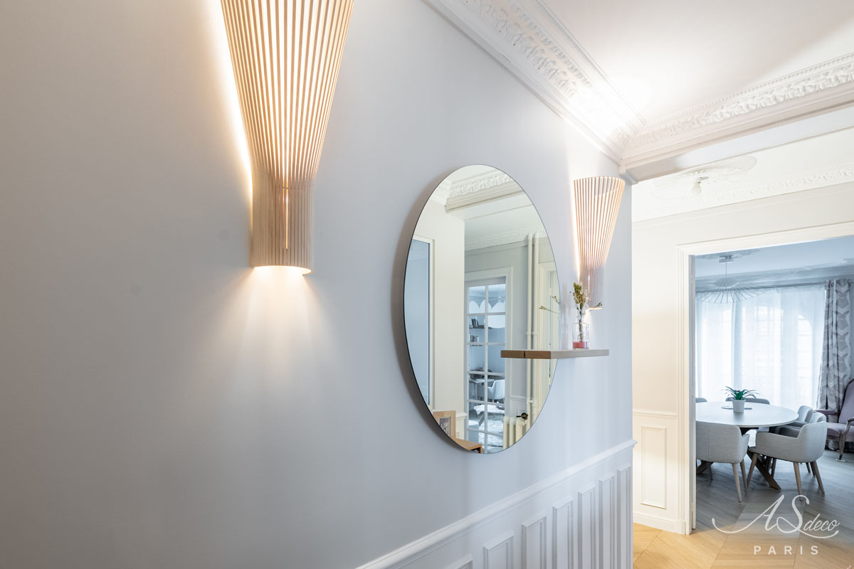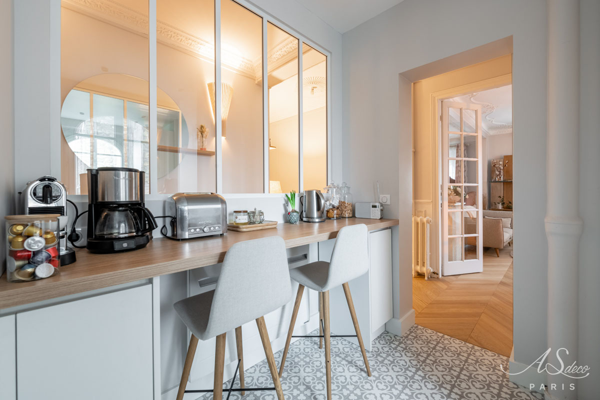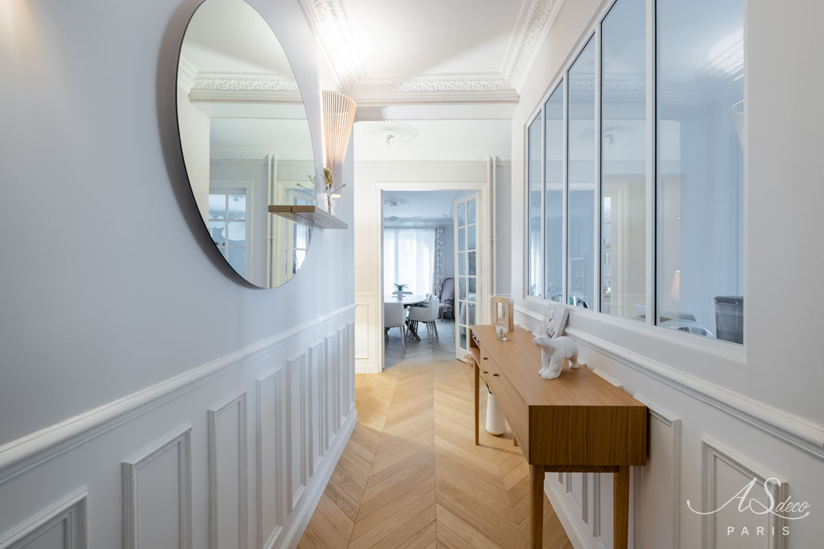 Lorsque nos clients, jeunes retraités, nous ont contactés : ils souhaitaient redonner tout son potentiel à leur appartement tout juste acheté. L’appartement bénéficiait de nombreux atouts de part la disposition des pièces principales (séjour et chambres) et des moulures au plafond déjà existantes. Seule la cuisine, l’entrée et les pièces d’eau avaient besoin d’être optimisées au mieux afin de faire entrer la lumière dans cet appartement déjà plein de cachet.