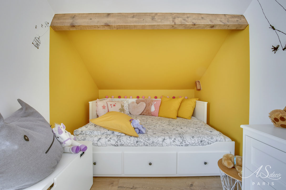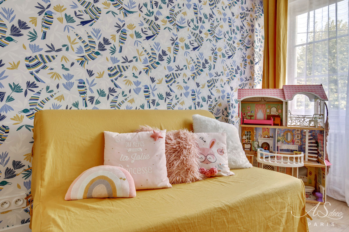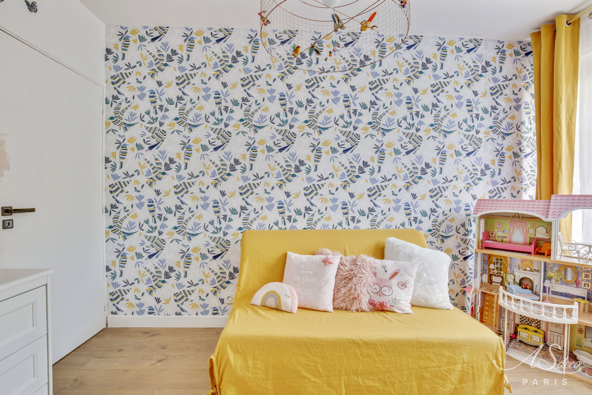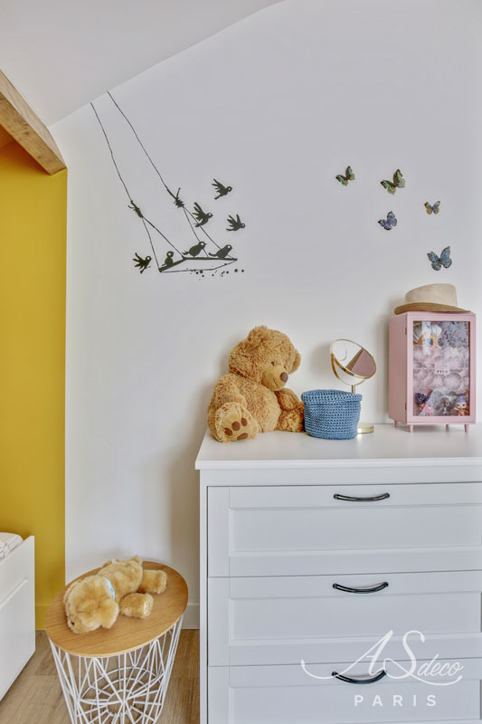 Nous avons choisi de placer le lit sous les combles pour optimiser la circulation et bénéficier ainsi de plus de rangements. La décoration sur la thématique des oiseaux s’est étendue du papier-peint jusqu’à la suspension. Nous avons joué sur le fait que la chambre était sous les toits pour imaginer la décoration en faisant ressortir les poutres qui laissaient planer l’idée d’un nid dans un arbre perché.
