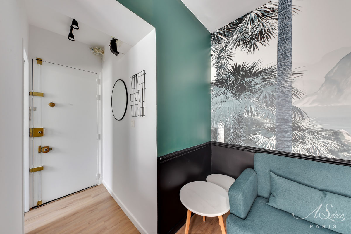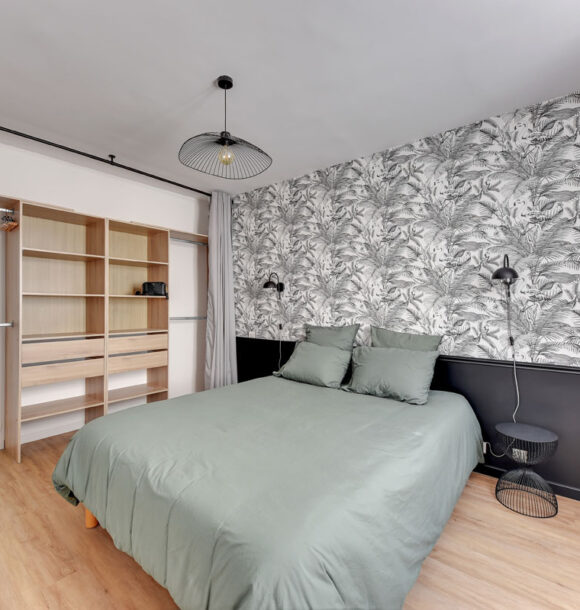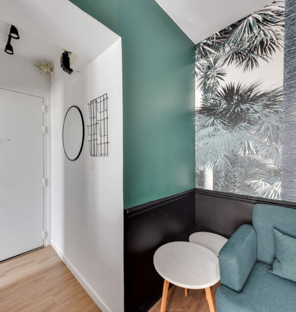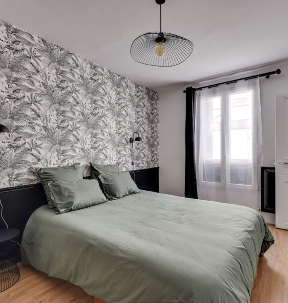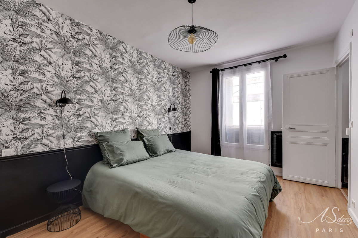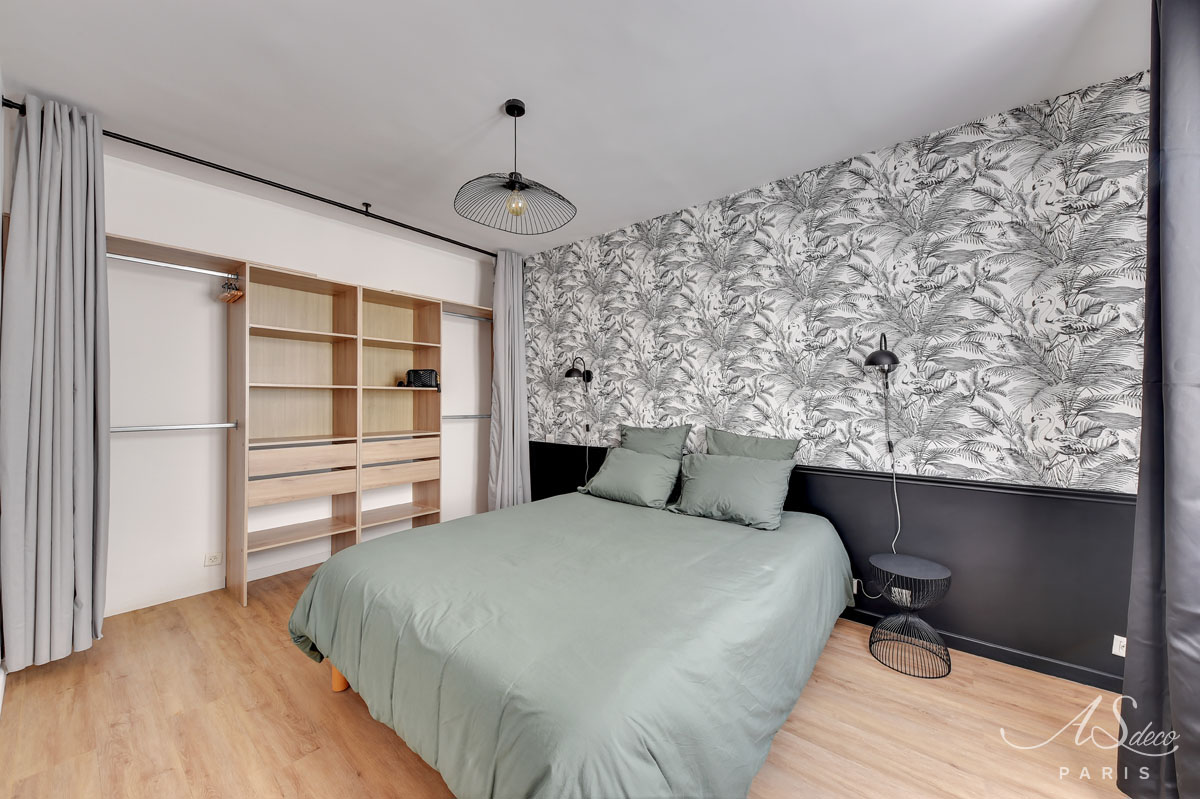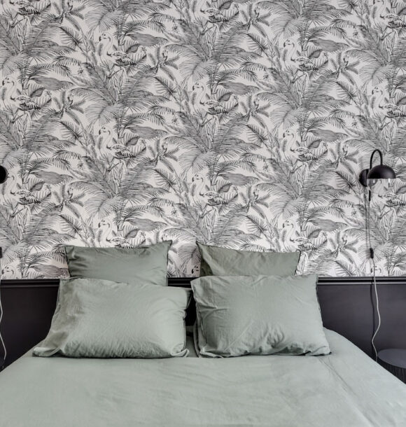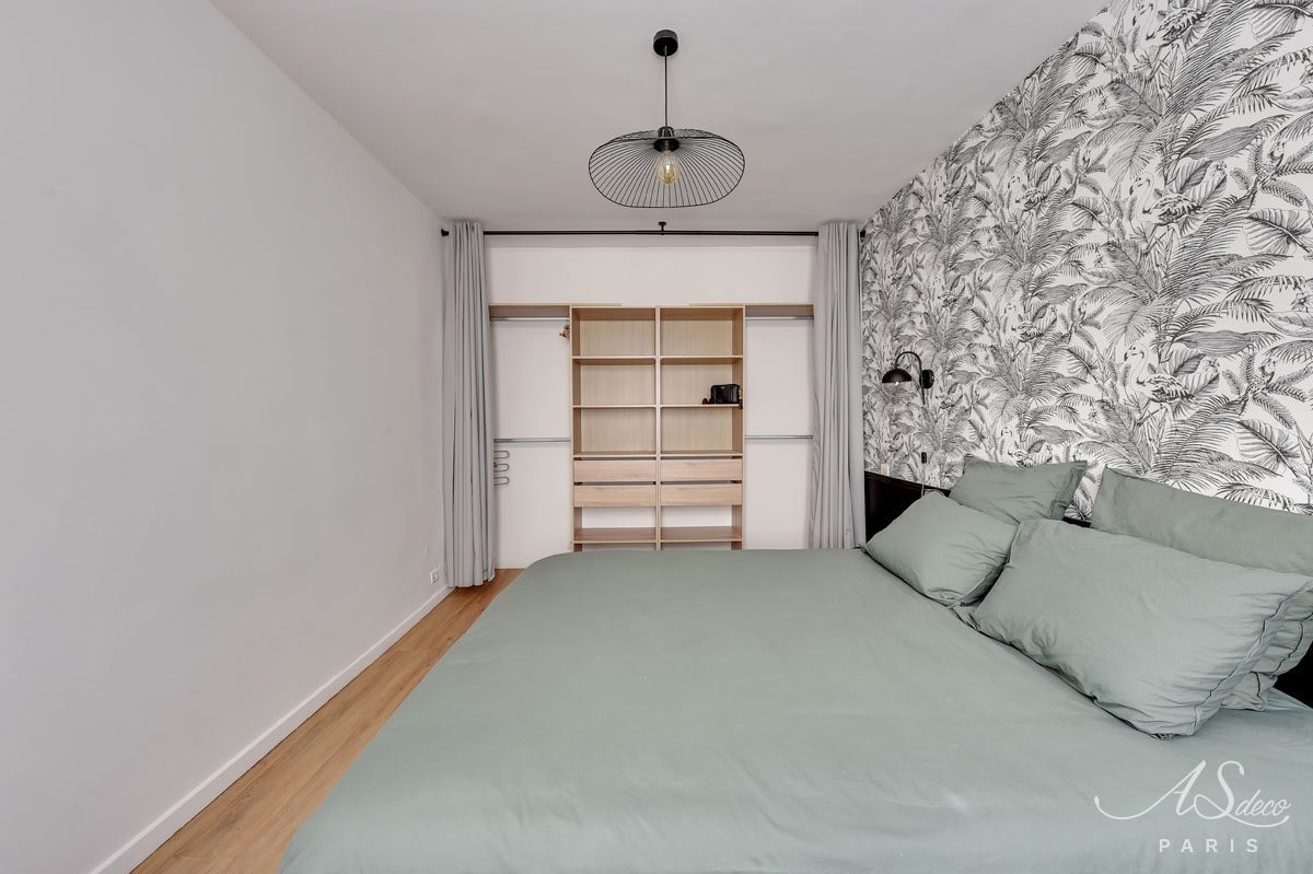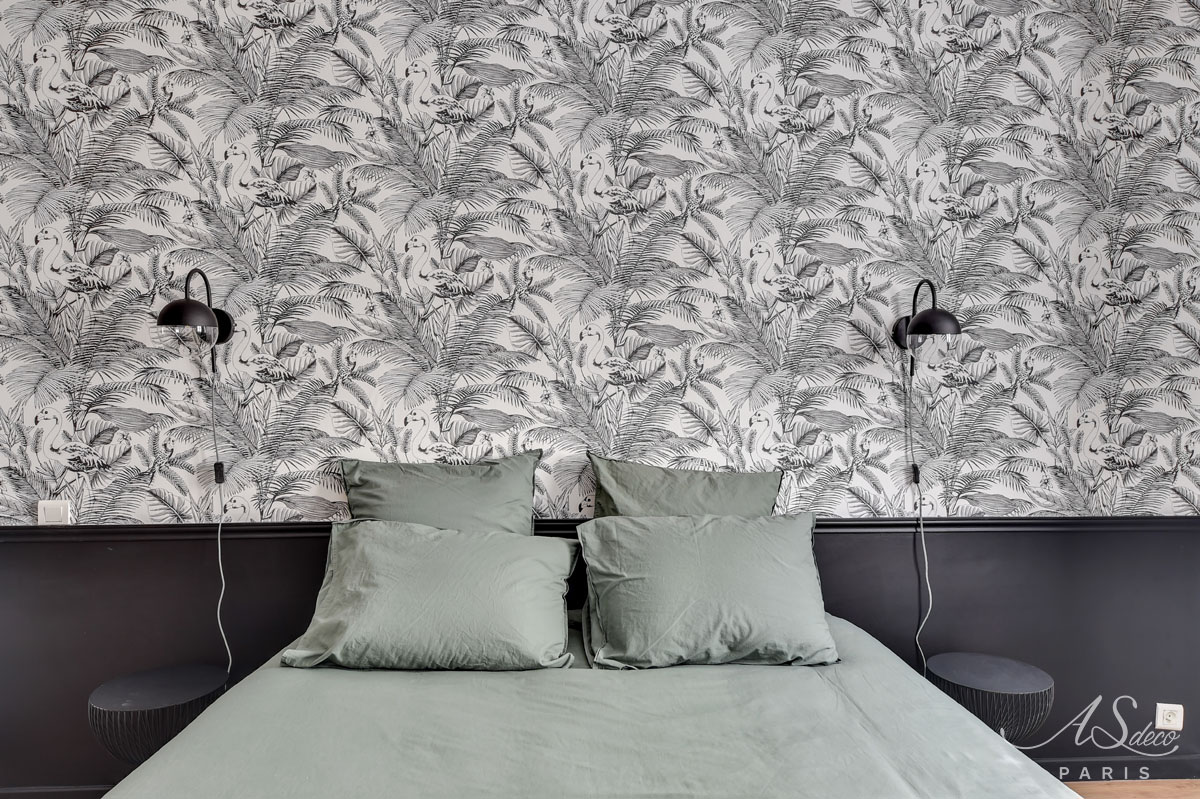 Nous avons repensé l’organisation du séjour et de la chambre en misant principalement sur la décoration. Notre choix a été de mixer l’ambiance chic parisienne à l’esprit tropical apporté par les papiers-peints.