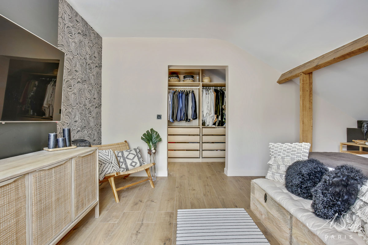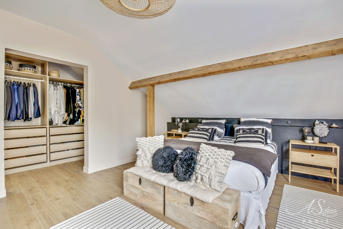 Dans cette chambre, tout était à imaginer. En effet, les combles n’étaient pas exploités et la chambre était trop petite pour y intégrer le lit que possédaient nos clients et un espace dressing digne de ce nom. Nous avons donc récupéré une partie de la salle de bain attenante pour y créer l’espace dressing et avons positionné le lit sous les combles. La chambre est dorénavant plus spacieuse.