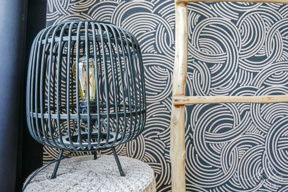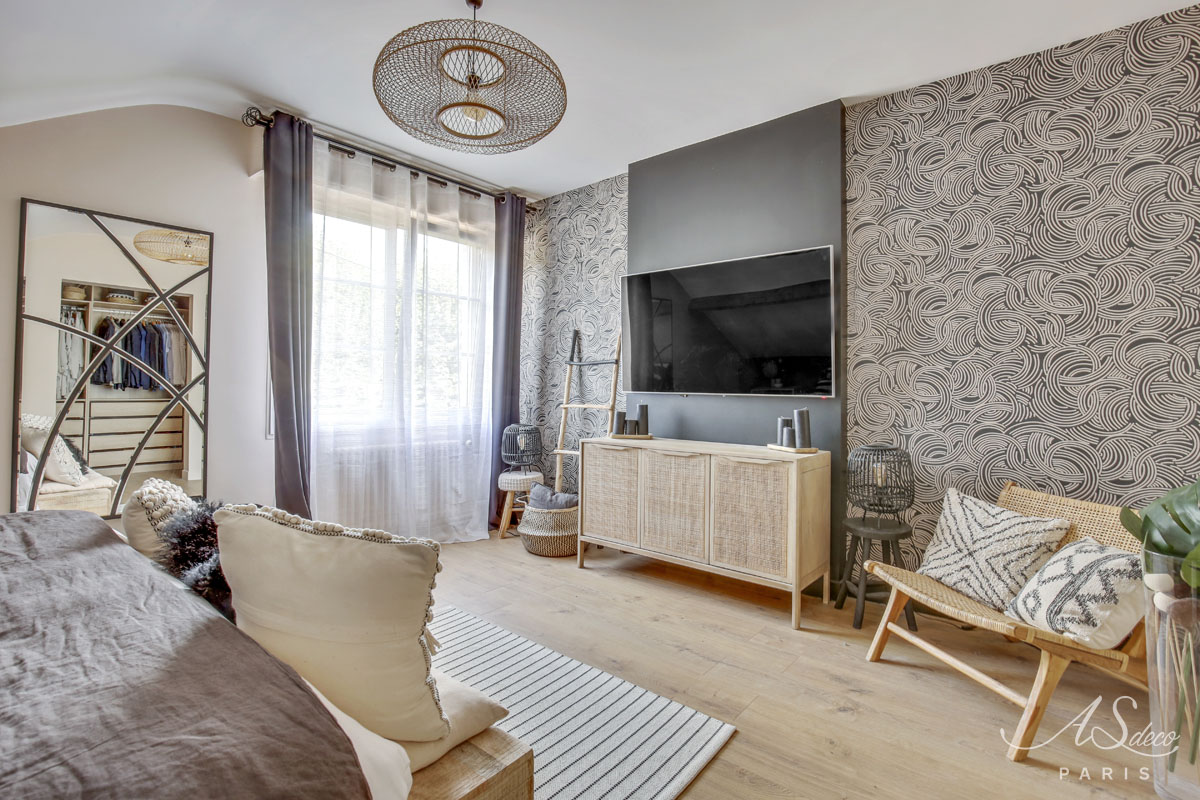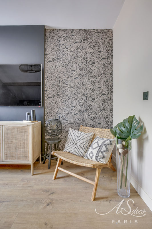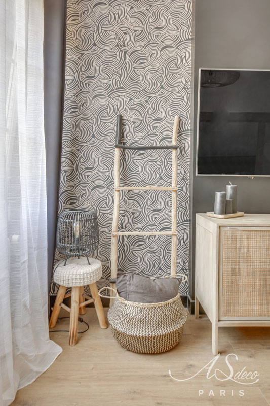 Côté déco, nous avons sélectionné du linge de lit en lin, placé des coussins en macramé et en laine de Mongolie. Pour mettre en valeur le mur face au lit et délimiter le décroché prévu pour la tv murale, nous avons proposé un papier-peint aux formes rondes donnant un caractère exotique à la pièce. Un espace lecture a été créé avec une assise en rotin, une fois de plus pour marquer l’esprit nomade de la décoration. Côté dressing, nous avons positionné des caissons Pax et commodes Malm de chez Ikea afin de respecter le budget annoncé au départ par les clients.